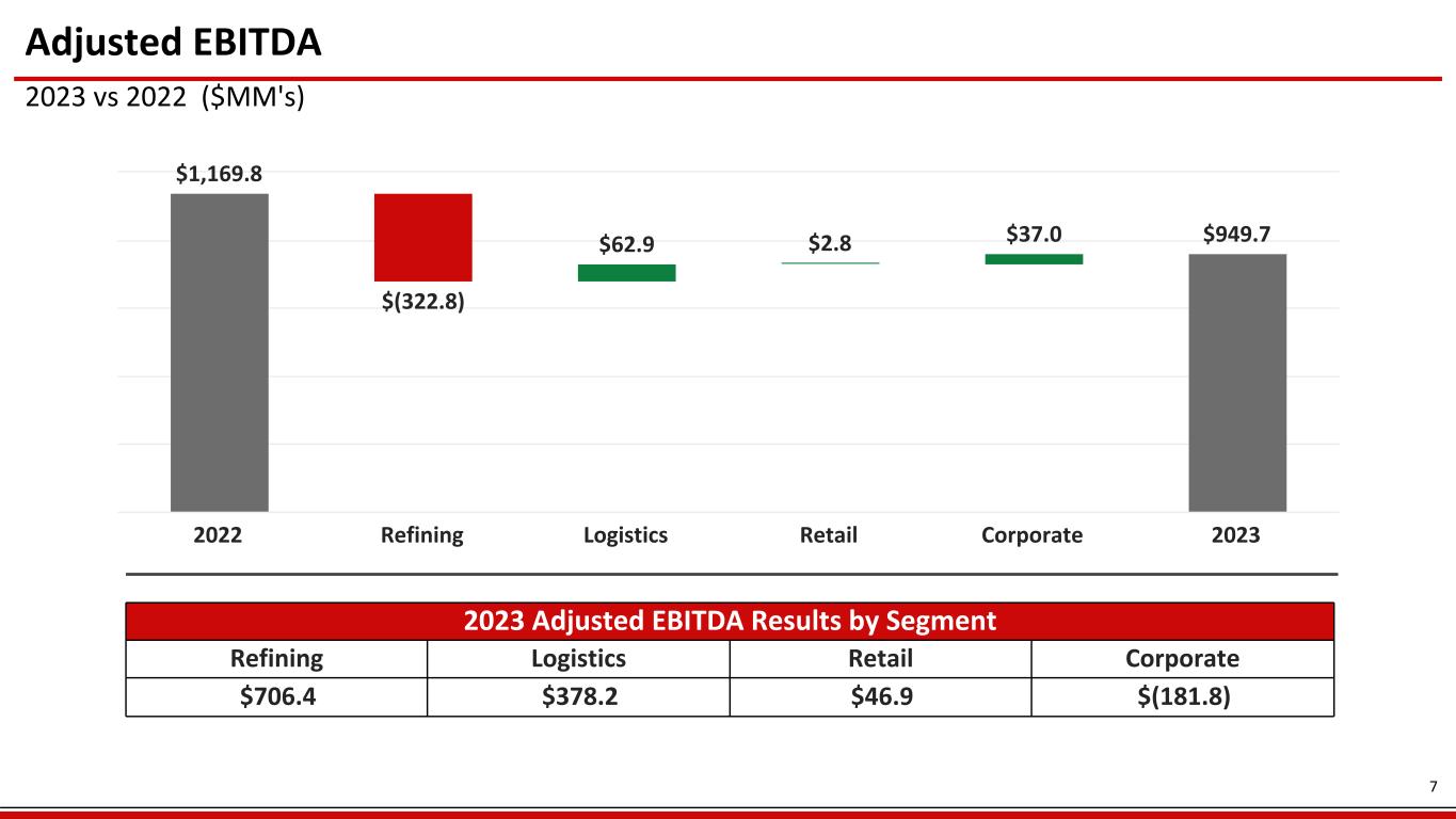 Adjusted EBITDA 2023 vs 2022 ($MM's) 2023 Adjusted EBITDA Results by Segment Refining Logistics Retail Corporate $706.4 $378.2 $46.9 $(181.8) $1,169.8 $(322.8) $62.9 $2.8 $37.0 $949.7 2022 Refining Logistics Retail Corporate 2023 7