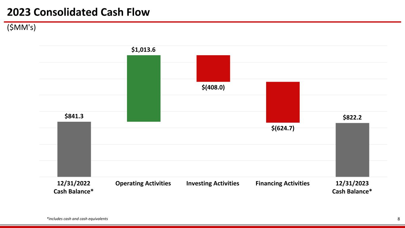 2023 Consolidated Cash Flow ($MM's) *includes cash and cash equivalents $841.3 $1,013.6 $(408.0) $(624.7) $822.2 12/31/2022 Cash Balance* Operating Activities Investing Activities Financing Activities 12/31/2023 Cash Balance* 8