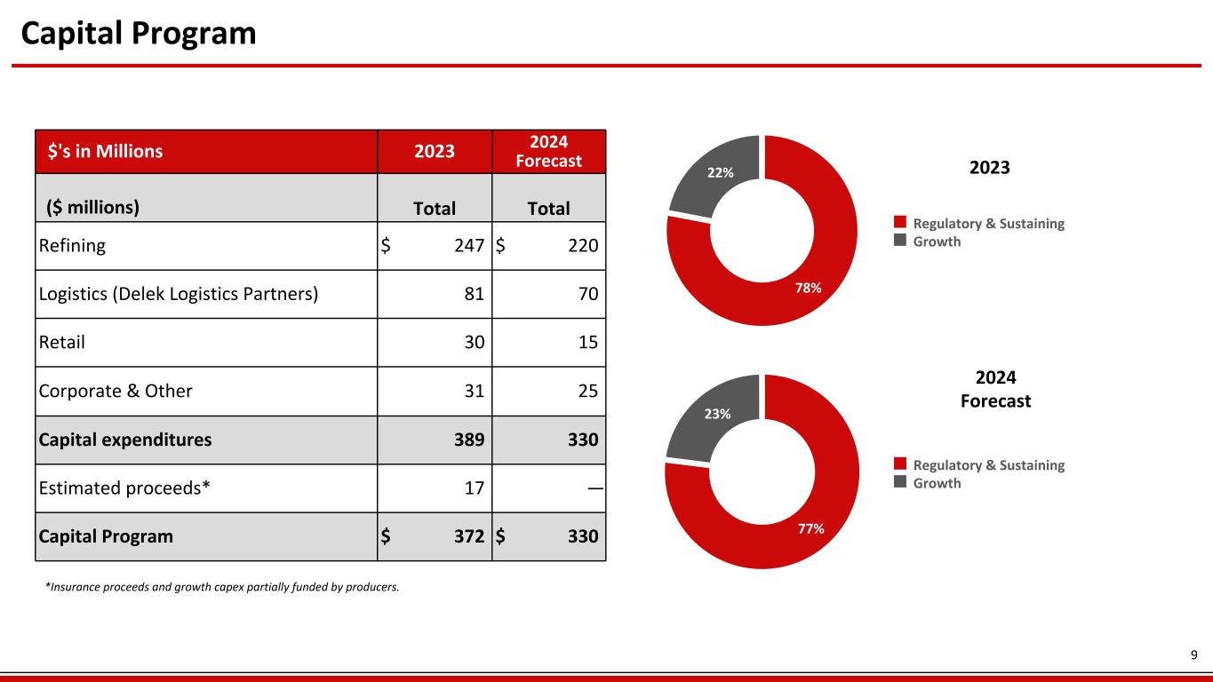 Capital Program $'s in Millions 2023 2024 Forecast ($ millions) Total Total Refining $ 247 $ 220 Logistics (Delek Logistics Partners) 81 70 Retail 30 15 Corporate & Other 31 25 Capital expenditures 389 330 Estimated proceeds* 17 — Capital Program $ 372 $ 330 2023 77% 23% Regulatory & Sustaining Growth 2024 Forecast 78% 22% Regulatory & Sustaining Growth *Insurance proceeds and growth capex partially funded by producers. 9