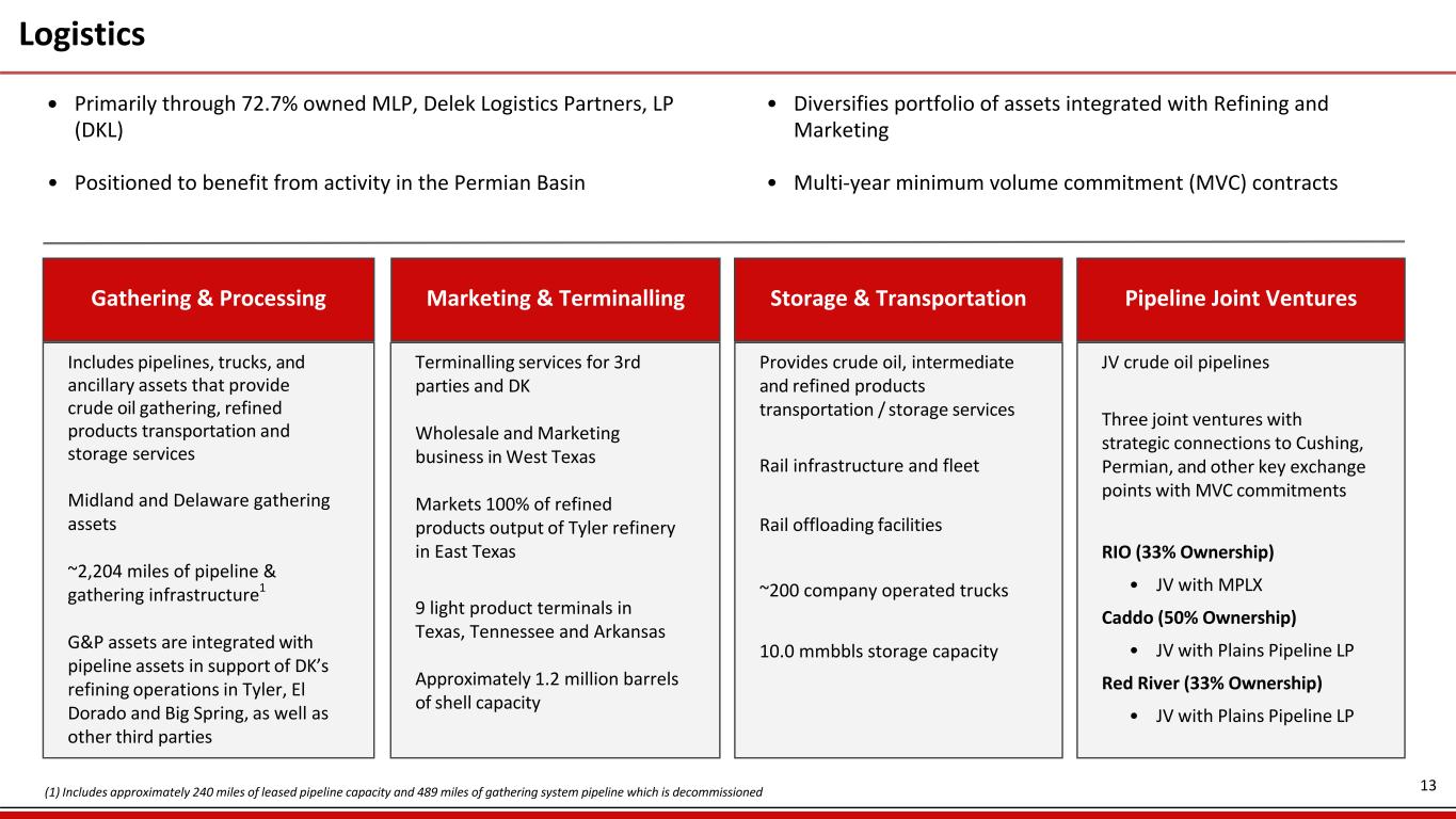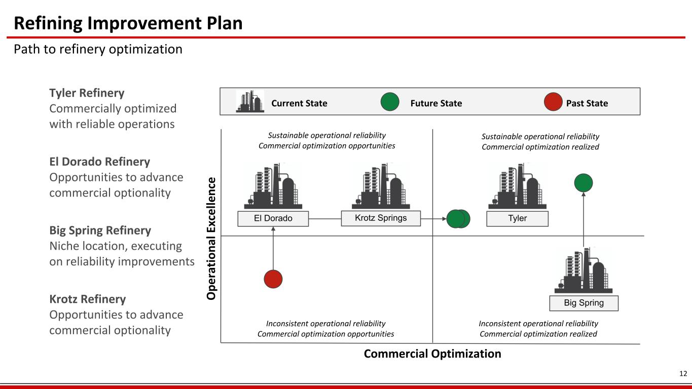 Inconsistent operational reliability Commercial optimization realized Refining Improvement Plan Path to refinery optimization O pe ra ti on al E xc el le nc e Commercial Optimization El Dorado TylerKrotz Springs Big Spring Tyler Refinery Commercially optimized with reliable operations El Dorado Refinery Opportunities to advance commercial optionality Big Spring Refinery Niche location, executing on reliability improvements Krotz Refinery Opportunities to advance commercial optionality Inconsistent operational reliability Commercial optimization opportunities Sustainable operational reliability Commercial optimization opportunities Sustainable operational reliability Commercial optimization realized Current State Future State Past State 12