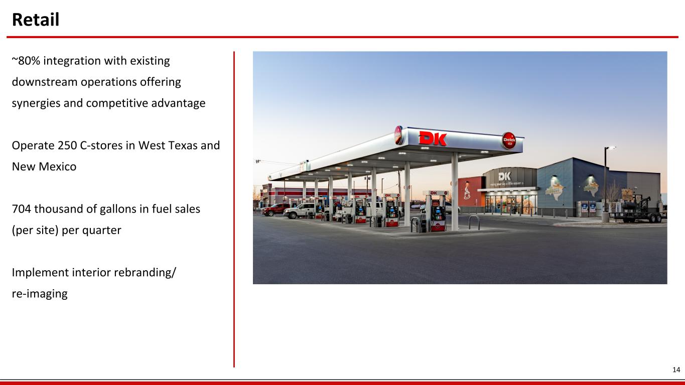 Gathering & Processing Marketing & Terminalling Storage & Transportation Pipeline Joint Ventures Includes pipelines, trucks, and ancillary assets that provide crude oil gathering, refined products transportation and storage services Midland and Delaware gathering assets ~2,204 miles of pipeline & gathering infrastructure1 G&P assets are integrated with pipeline assets in support of DK’s refining operations in Tyler, El Dorado and Big Spring, as well as other third parties Terminalling services for 3rd parties and DK Wholesale and Marketing business in West Texas Markets 100% of refined products output of Tyler refinery in East Texas 9 light product terminals in Texas, Tennessee and Arkansas Approximately 1.2 million barrels of shell capacity Provides crude oil, intermediate and refined products transportation / storage services Rail infrastructure and fleet Rail offloading facilities ~200 company operated trucks 10.0 mmbbls storage capacity JV crude oil pipelines Three joint ventures with strategic connections to Cushing, Permian, and other key exchange points with MVC commitments RIO (33% Ownership) • JV with MPLX Caddo (50% Ownership) • JV with Plains Pipeline LP Red River (33% Ownership) • JV with Plains Pipeline LP Logistics 13 • Primarily through 72.7% owned MLP, Delek Logistics Partners, LP (DKL) • Positioned to benefit from activity in the Permian Basin • Diversifies portfolio of assets integrated with Refining and Marketing • Multi-year minimum volume commitment (MVC) contracts (1) Includes approximately 240 miles of leased pipeline capacity and 489 miles of gathering system pipeline which is decommissioned