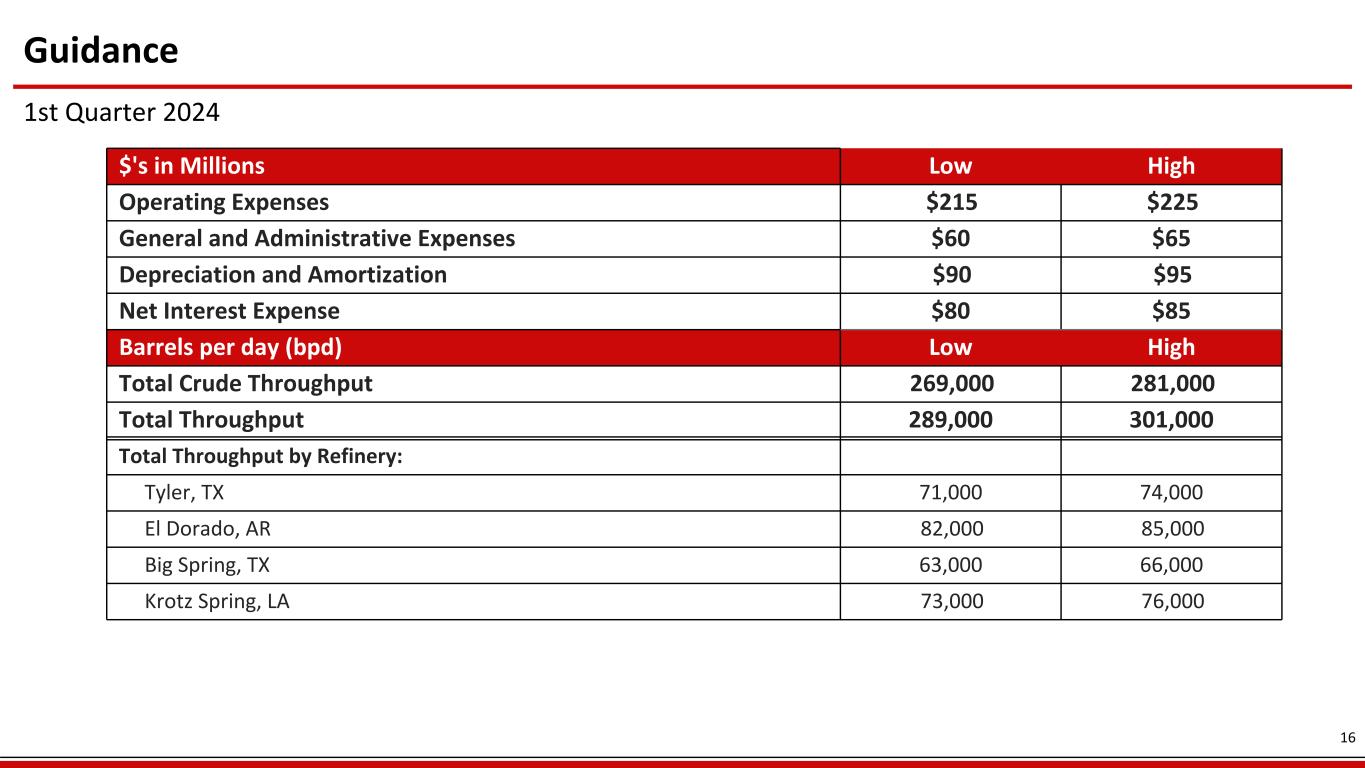 Guidance 1st Quarter 2024 $'s in Millions Low High Operating Expenses $215 $225 General and Administrative Expenses $60 $65 Depreciation and Amortization $90 $95 Net Interest Expense $80 $85 Barrels per day (bpd) Low High Total Crude Throughput 269,000 281,000 Total Throughput 289,000 301,000 Total Throughput by Refinery: Tyler, TX 71,000 74,000 El Dorado, AR 82,000 85,000 Big Spring, TX 63,000 66,000 Krotz Spring, LA 73,000 76,000 16