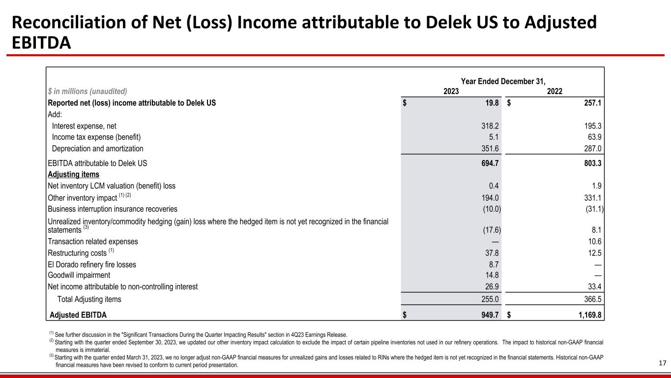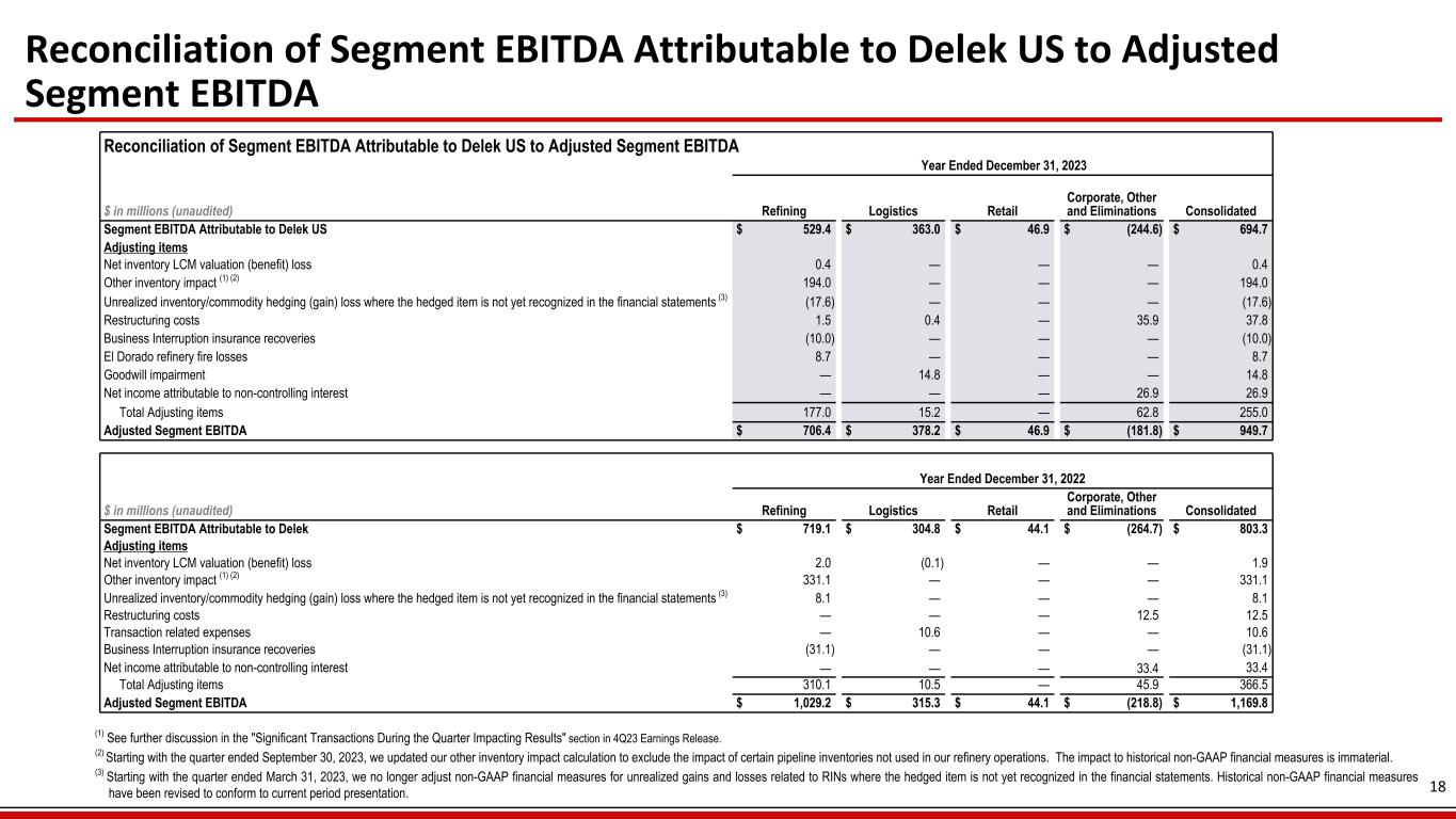 Reconciliation of Net (Loss) Income attributable to Delek US to Adjusted EBITDA Year Ended December 31, $ in millions (unaudited) 2023 2022 Reported net (loss) income attributable to Delek US $ 19.8 $ 257.1 Add: Interest expense, net 318.2 195.3 Income tax expense (benefit) 5.1 63.9 Depreciation and amortization 351.6 287.0 EBITDA attributable to Delek US 694.7 803.3 Adjusting items Net inventory LCM valuation (benefit) loss 0.4 1.9 Other inventory impact (1) (2) 194.0 331.1 Business interruption insurance recoveries (10.0) (31.1) Unrealized inventory/commodity hedging (gain) loss where the hedged item is not yet recognized in the financial statements (3) (17.6) 8.1 Transaction related expenses — 10.6 Restructuring costs (1) 37.8 12.5 El Dorado refinery fire losses 8.7 — Goodwill impairment 14.8 — Net income attributable to non-controlling interest 26.9 33.4 Total Adjusting items 255.0 366.5 Adjusted EBITDA $ 949.7 $ 1,169.8 (1) See further discussion in the "Significant Transactions During the Quarter Impacting Results" section in 4Q23 Earnings Release. (2) Starting with the quarter ended September 30, 2023, we updated our other inventory impact calculation to exclude the impact of certain pipeline inventories not used in our refinery operations. The impact to historical non-GAAP financial measures is immaterial. (3) Starting with the quarter ended March 31, 2023, we no longer adjust non-GAAP financial measures for unrealized gains and losses related to RINs where the hedged item is not yet recognized in the financial statements. Historical non-GAAP financial measures have been revised to conform to current period presentation. 17