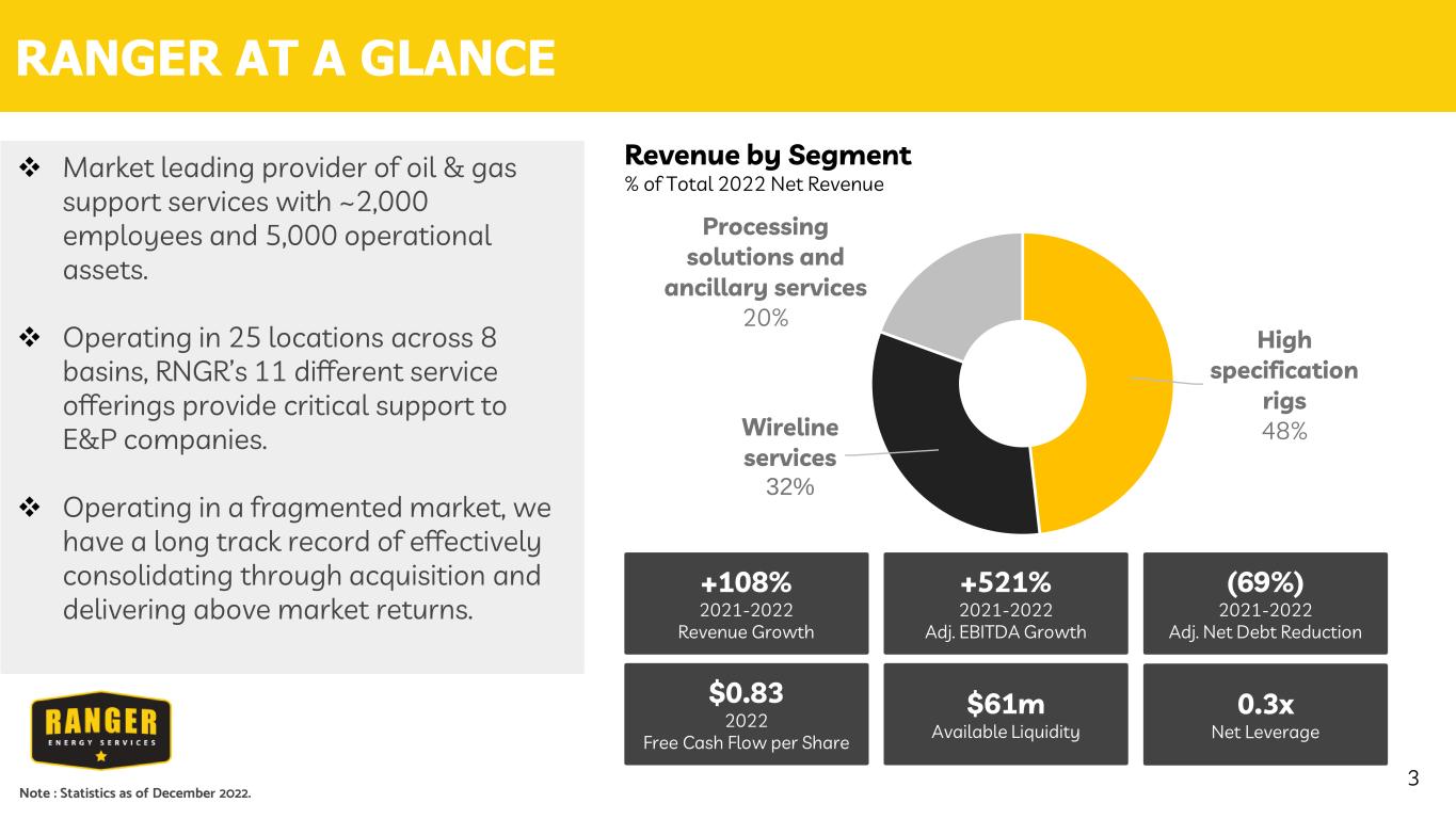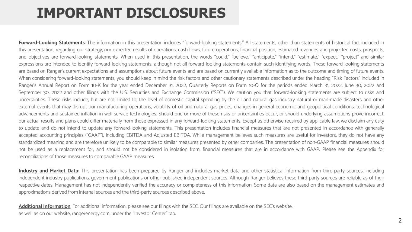 Forward-Looking Statements: The information in this presentation includes “forward-looking statements.” All statements, other than statements of historical fact included in this presentation, regarding our strategy, our expected results of operations, cash flows, future operations, financial position, estimated revenues and projected costs, prospects, and objectives are forward-looking statements. When used in this presentation, the words “could,” “believe,” “anticipate,” “intend,” “estimate,” “expect,” “project” and similar expressions are intended to identify forward-looking statements, although not all forward-looking statements contain such identifying words. These forward-looking statements are based on Ranger’s current expectations and assumptions about future events and are based on currently available information as to the outcome and timing of future events. When considering forward-looking statements, you should keep in mind the risk factors and other cautionary statements described under the heading “Risk Factors” included in Ranger’s Annual Report on Form 10-K for the year ended December 31, 2022, Quarterly Reports on Form 10-Q for the periods ended March 31, 2022, June 30, 2022 and September 30, 2022 and other filings with the U.S. Securities and Exchange Commission (“SEC”). We caution you that forward-looking statements are subject to risks and uncertainties. These risks include, but are not limited to, the level of domestic capital spending by the oil and natural gas industry natural or man-made disasters and other external events that may disrupt our manufacturing operations, volatility of oil and natural gas prices, changes in general economic and geopolitical conditions, technological advancements and sustained inflation in well service technologies. Should one or more of these risks or uncertainties occur, or should underlying assumptions prove incorrect, our actual results and plans could differ materially from those expressed in any forward-looking statements. Except as otherwise required by applicable law, we disclaim any duty to update and do not intend to update any forward-looking statements. This presentation includes financial measures that are not presented in accordance with generally accepted accounting principles ("GAAP"), including EBITDA and Adjusted EBITDA. While management believes such measures are useful for investors, they do not have any standardized meaning and are therefore unlikely to be comparable to similar measures presented by other companies. The presentation of non-GAAP financial measures should not be used as a replacement for, and should not be considered in isolation from, financial measures that are in accordance with GAAP. Please see the Appendix for reconciliations of those measures to comparable GAAP measures. Industry and Market Data: This presentation has been prepared by Ranger and includes market data and other statistical information from third-party sources, including independent industry publications, government publications or other published independent sources. Although Ranger believes these third-party sources are reliable as of their respective dates, Management has not independently verified the accuracy or completeness of this information. Some data are also based on the management estimates and approximations derived from internal sources and the third-party sources described above. Additional Information: For additional information, please see our filings with the SEC. Our filings are available on the SEC’s website, as well as on our website, rangerenergy.com, under the “Investor Center” tab. IMPORTANT DISCLOSURES 2