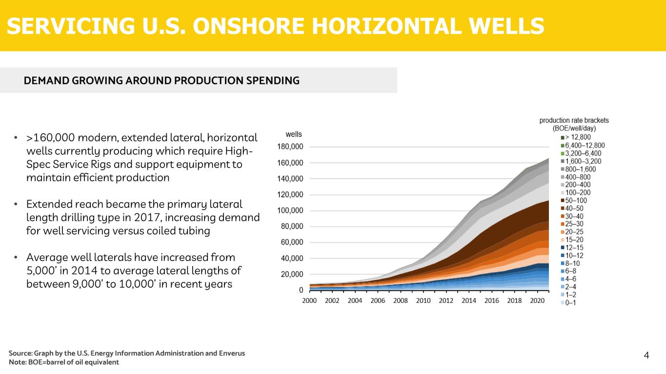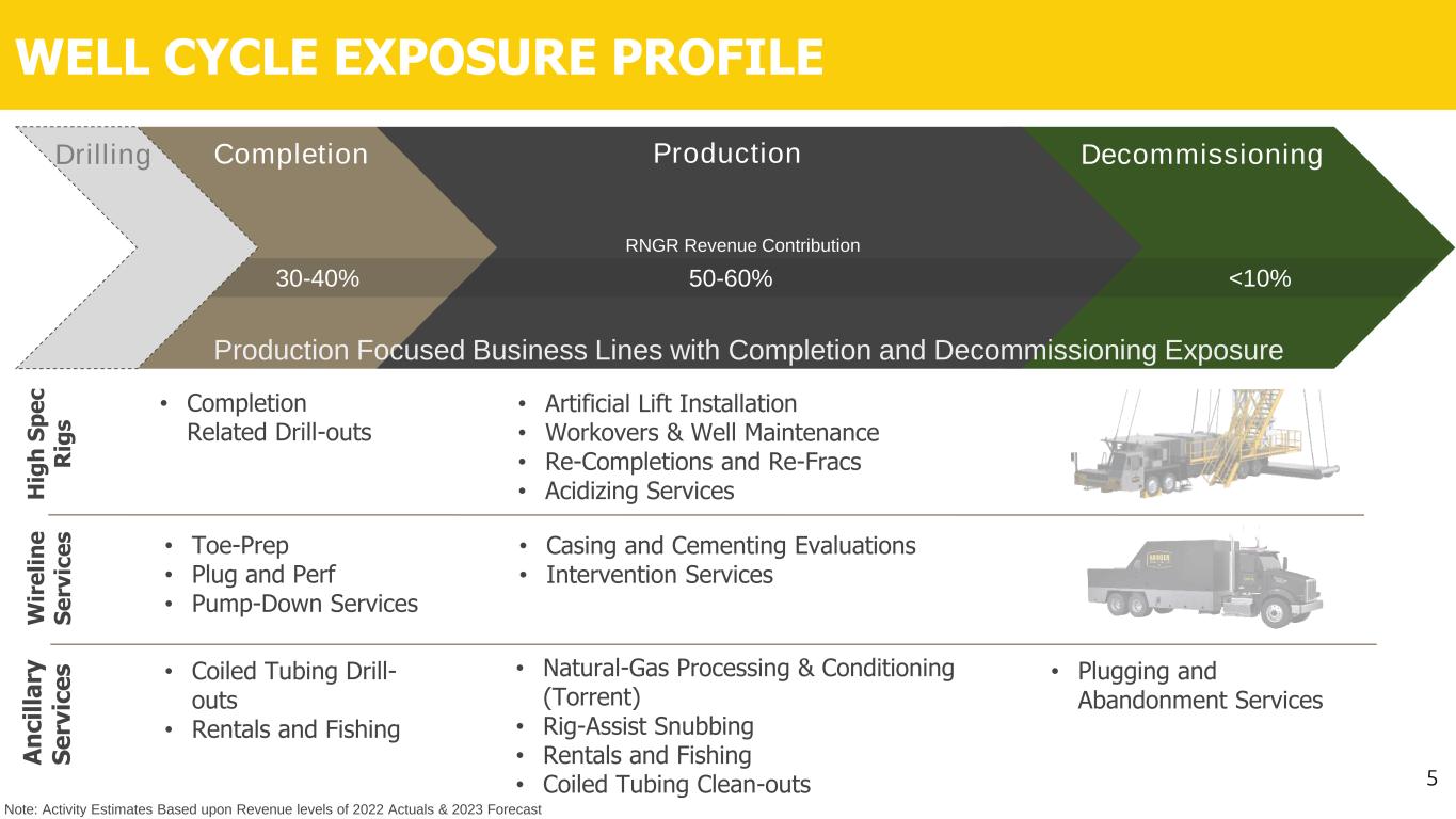 • >160,000 modern, extended lateral, horizontal wells currently producing which require High- Spec Service Rigs and support equipment to maintain efficient production • Extended reach became the primary lateral length drilling type in 2017, increasing demand for well servicing versus coiled tubing • Average well laterals have increased from 5,000’ in 2014 to average lateral lengths of between 9,000’ to 10,000’ in recent years SERVICING U.S. ONSHORE HORIZONTAL WELLS DEMAND GROWING AROUND PRODUCTION SPENDING Source: Graph by the U.S. Energy Information Administration and Enverus Note: BOE=barrel of oil equivalent 4