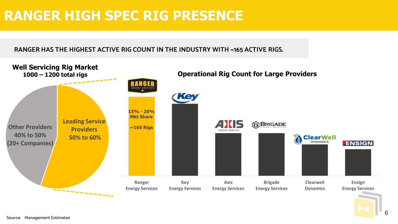WELL CYCLE EXPOSURE PROFILE 5 • Completion Related Drill-outs H ig h S p e c R ig s • Artificial Lift Installation • Workovers & Well Maintenance • Re-Completions and Re-Fracs • Acidizing Services W ir e li n e S e rv ic e s • Toe-Prep • Plug and Perf • Pump-Down Services • Casing and Cementing Evaluations • Intervention Services A n c il la ry S e rv ic e s • Coiled Tubing Drill- outs • Rentals and Fishing • Natural-Gas Processing & Conditioning (Torrent) • Rig-Assist Snubbing • Rentals and Fishing • Coiled Tubing Clean-outs • Plugging and Abandonment Services Note: Activity Estimates Based upon Revenue levels of 2022 Actuals & 2023 Forecast Completion DecommissioningProduction Production Focused Business Lines with Completion and Decommissioning Exposure 30-40% 50-60% <10% Drilling RNGR Revenue Contribution