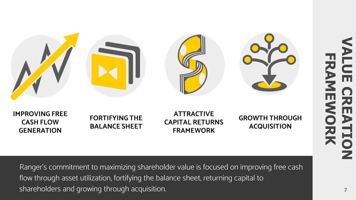 Ranger Energy Services Key Energy Services Axis Energy Services Brigade Energy Services Clearwell Dynamics Ensign Energy Services RANGER HIGH SPEC RIG PRESENCE Source: Management Estimates 6 RANGER HAS THE HIGHEST ACTIVE RIG COUNT IN THE INDUSTRY WITH ~165 ACTIVE RIGS. Leading Service Providers 50% to 60% Other Providers 40% to 50% (20+ Companies) Well Servicing Rig Market 1000 – 1200 total rigs Operational Rig Count for Large Providers 15% - 20% Mkt Share ~165 Rigs