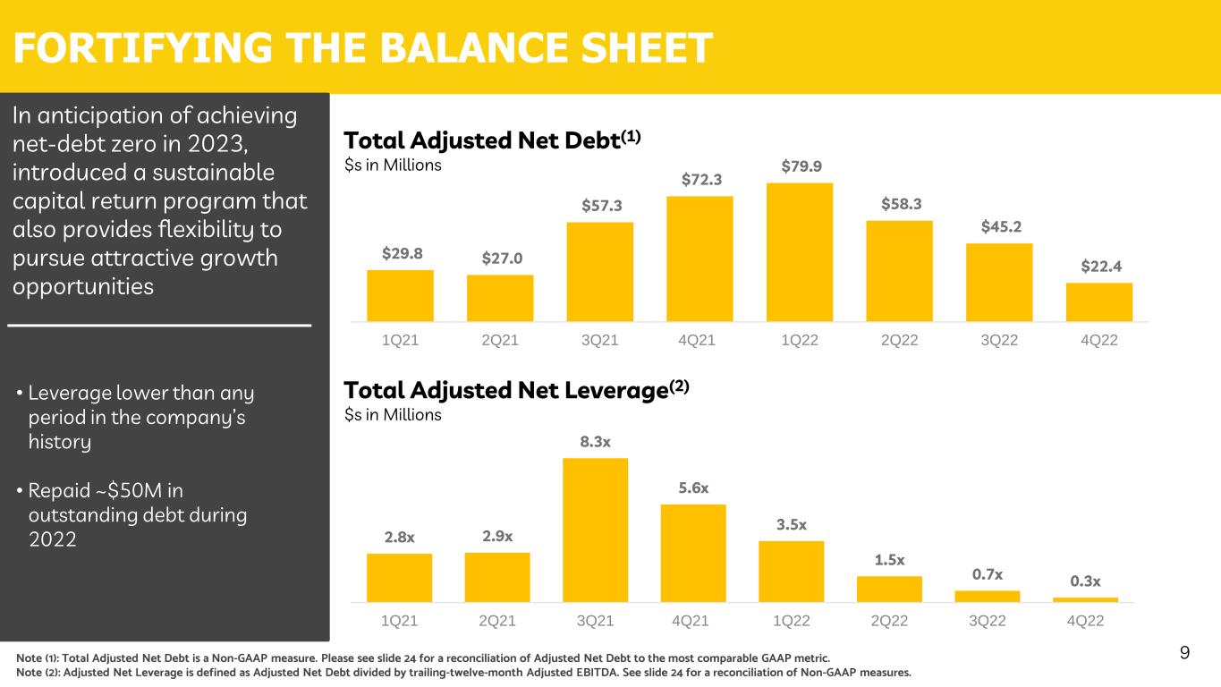 IMPROVING CASH FLOW THROUGH UTILIZATION 8 Note (1): Charts designed to show earnings capacity and should not be relied upon as company guidance. Opportunity to grow revenues & profitability through deployment of additional assets available for activation • Ability to improve utilization contingent on market and easing labor & supply chain constraints and further penetration in existing markets • Additional rig capacity exists beyond illustrative opportunity with reactivation capital outside of normal maintenance capex Processing Solutions & Ancillary Services Adj EBITDA(1) $s in Millions Wireline Services Adj EBITDA(1) $s in Millions High Specification Rig Adj EBITDA(1) $s in Millions $12 $21 $61 $75 2020 2021 2022 Illustrative Opportunity $25 $2 $18 $24 2020 2021 2022 Illustrative Opportunity $4 $6 $26 $30 2020 2021 2022 Illustrative Opportunity