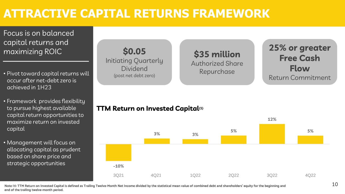 $29.8 $27.0 $57.3 $72.3 $79.9 $58.3 $45.2 $22.4 1Q21 2Q21 3Q21 4Q21* 1Q22 2Q22 3Q22 4Q22 FORTIFYING THE BALANCE SHEET 9Note (1): Total Adjusted Net Debt is a Non-GAAP measure. Please see slide 24 for a reconciliation of Adjusted Net Debt to the most comparable GAAP metric. Note (2): Adjusted Net Leverage is defined as Adjusted Net Debt divided by trailing-twelve-month Adjusted EBITDA. See slide 24 for a reconciliation of Non-GAAP measures. In anticipation of achieving net-debt zero in 2023, introduced a sustainable capital return program that also provides flexibility to pursue attractive growth opportunities • Leverage lower than any period in the company’s history • Repaid ~$50M in outstanding debt during 2022 Total Adjusted Net Debt(1) $s in Millions 2.8x 2.9x 8.3x 5.6x 3.5x 1.5x 0.7x 0.3x 1Q21 2Q21 3Q21 4Q21* 1Q22 2Q22 3Q22 4Q22 Total Adjusted Net Leverage(2) $s in Millions