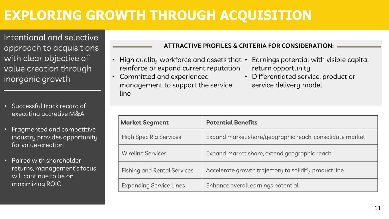ATTRACTIVE CAPITAL RETURNS FRAMEWORK 10Note (1): TTM Return on Invested Capital is defined as Trailing Twelve-Month Net Income divided by the statistical mean value of combined debt and shareholders’ equity for the beginning and end of the trailing twelve-month period. Focus is on balanced capital returns and maximizing ROIC • Pivot toward capital returns will occur after net-debt zero is achieved in 1H23 • Framework provides flexibility to pursue highest available capital return opportunities to maximize return on invested capital • Management will focus on allocating capital as prudent based on share price and strategic opportunities $0.05 Initiating Quarterly Dividend (post net debt zero) $35 million Authorized Share Repurchase 25% or greater Free Cash Flow Return Commitment -10% 3% 3% 5% 12% 5% 3Q21 4Q21* 1Q22 2Q22 3Q22 4Q22 TTM Return on Invested Capital(1)
