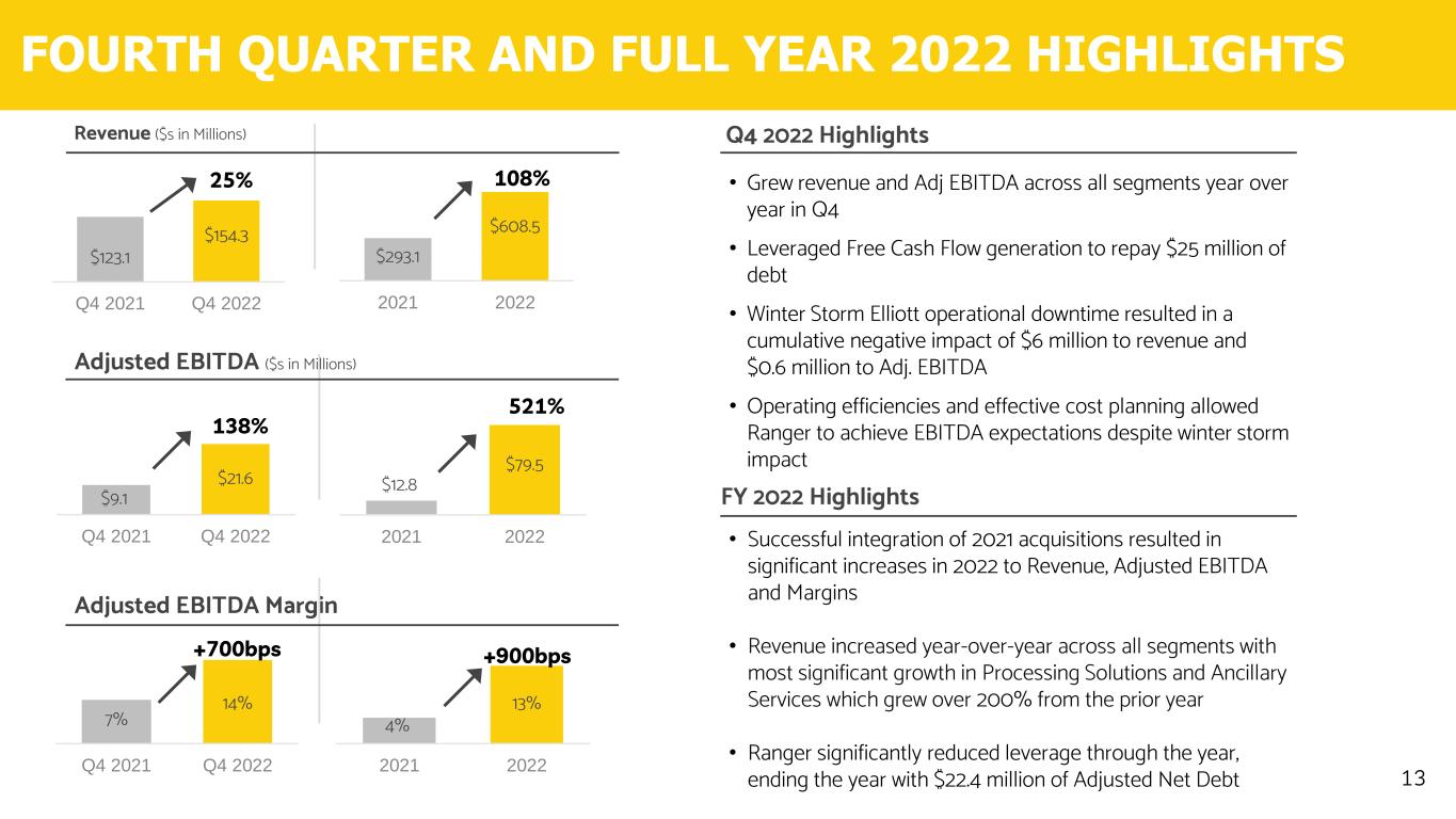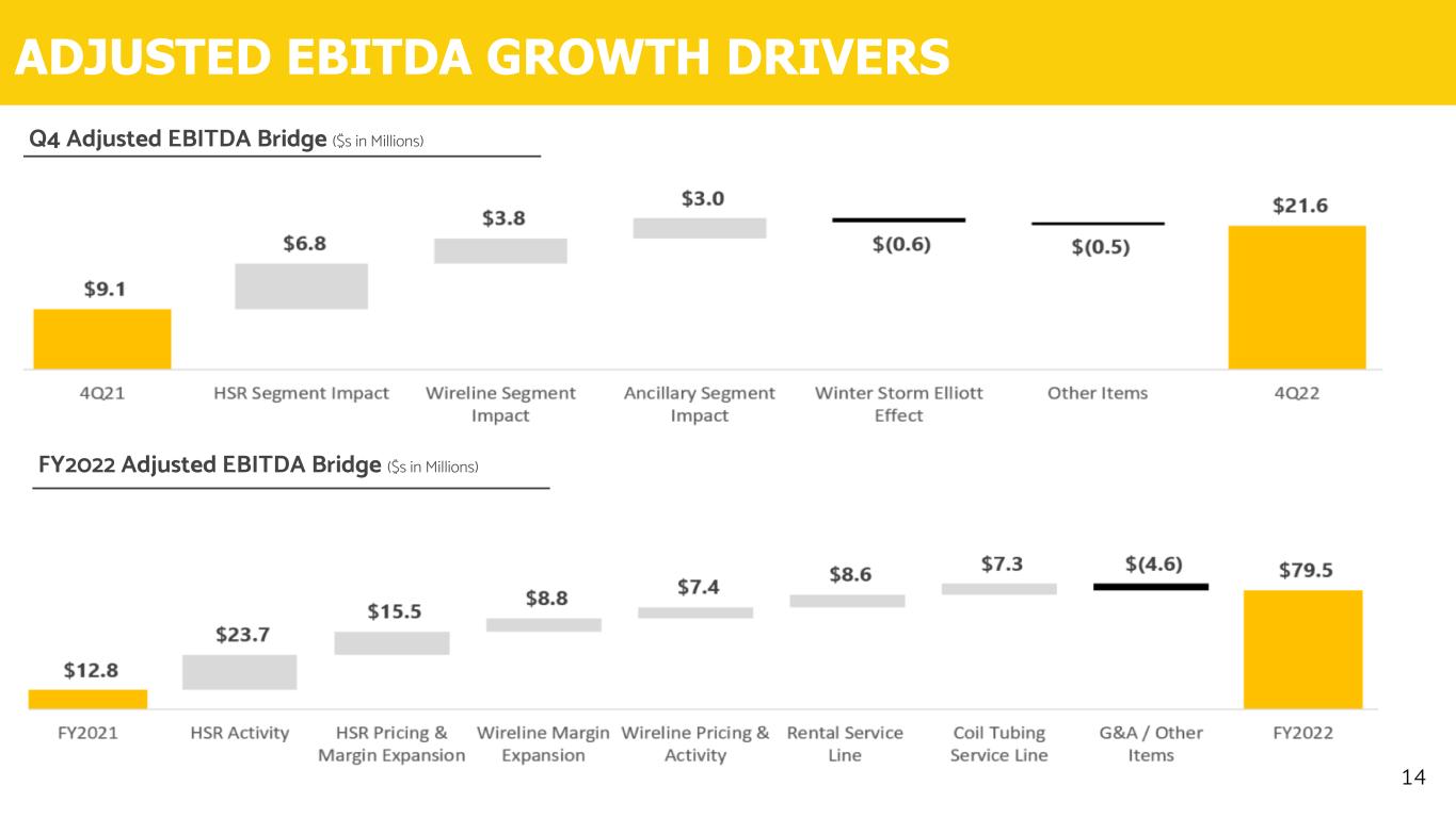 FOURTH QUARTER AND FULL YEAR 2022 HIGHLIGHTS 13 $293.1 $608.5 2021 2022 108% $123.1 $154.3 Q4 2021 Q4 2022 Revenue ($s in Millions) $9.1 $21.6 Q4 2021 Q4 2022 $12.8 $79.5 2021 2022 Adjusted EBITDA ($s in Millions) 521% Adjusted EBITDA Margin 7% 14% Q4 2021 Q4 2022 4% 13% 2021 2022 • Successful integration of 2021 acquisitions resulted in significant increases in 2022 to Revenue, Adjusted EBITDA and Margins • Revenue increased year-over-year across all segments with most significant growth in Processing Solutions and Ancillary Services which grew over 200% from the prior year • Ranger significantly reduced leverage through the year, ending the year with $22.4 million of Adjusted Net Debt Q4 2022 Highlights FY 2022 Highlights • Grew revenue and Adj EBITDA across all segments year over year in Q4 • Leveraged Free Cash Flow generation to repay $25 million of debt • Winter Storm Elliott operational downtime resulted in a cumulative negative impact of $6 million to revenue and $0.6 million to Adj. EBITDA • Operating efficiencies and effective cost planning allowed Ranger to achieve EBITDA expectations despite winter storm impact +700bps +900bps 25% 138%