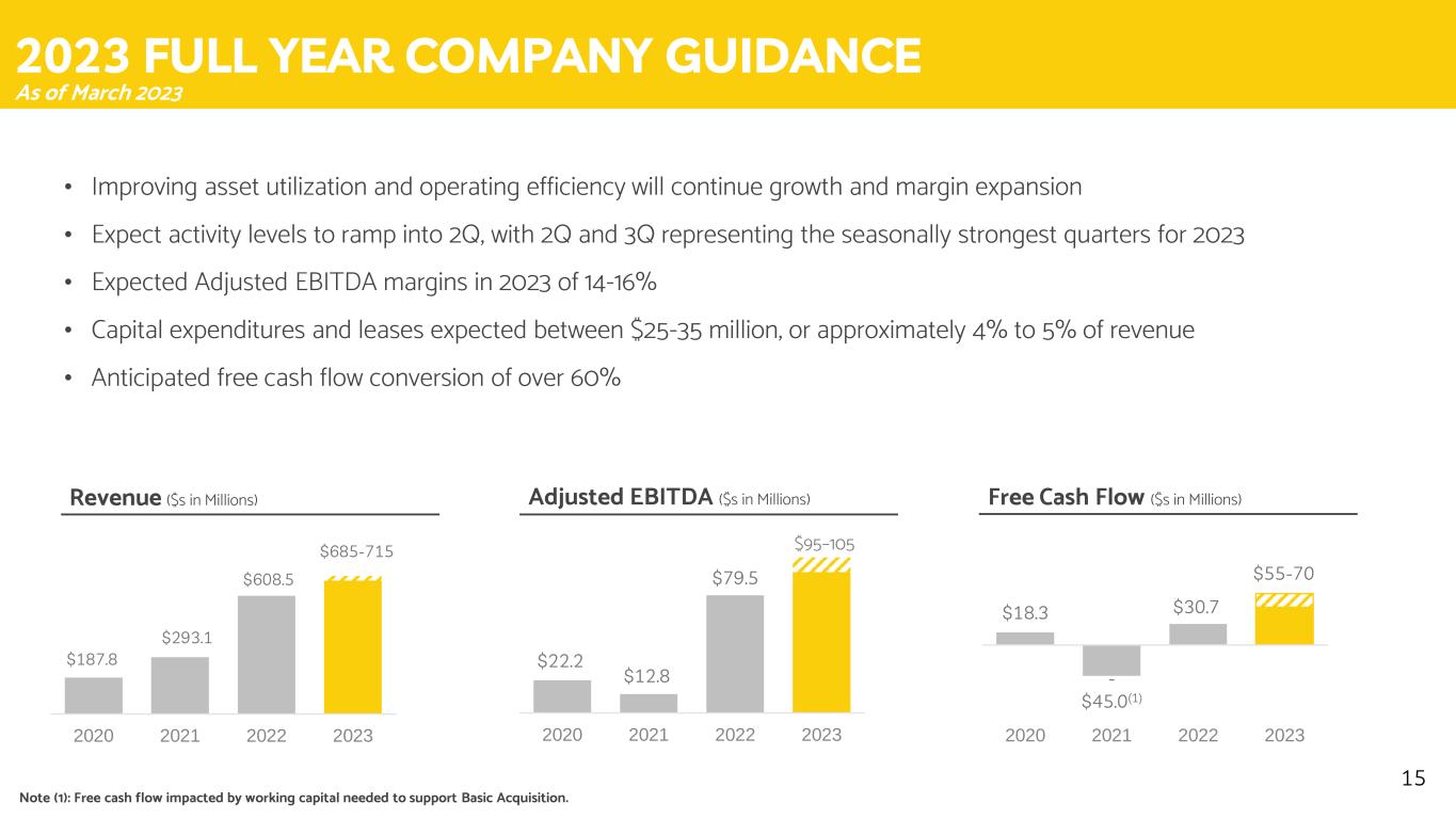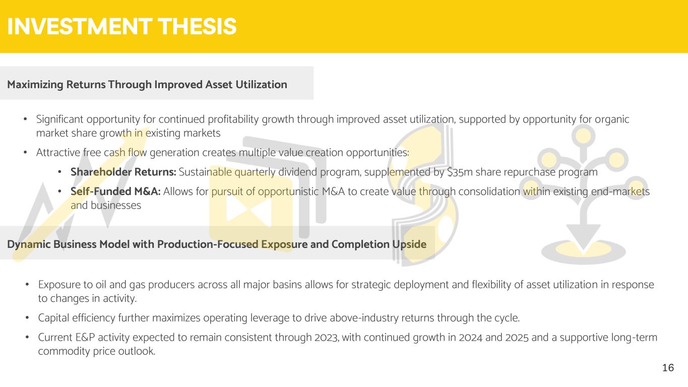 2023 FULL YEAR COMPANY GUIDANCE • Improving asset utilization and operating efficiency will continue growth and margin expansion • Expect activity levels to ramp into 2Q, with 2Q and 3Q representing the seasonally strongest quarters for 2023 • Expected Adjusted EBITDA margins in 2023 of 14-16% • Capital expenditures and leases expected between $25-35 million, or approximately 4% to 5% of revenue • Anticipated free cash flow conversion of over 60% 15 $18.3 - $45.0(1) $30.7 $55-70 2020 2021 2022 2023 $95–105 Revenue ($s in Millions) Adjusted EBITDA ($s in Millions) Free Cash Flow ($s in Millions) As of March 2023 $187.8 $293.1 $608.5 $685-715 2020 2021 2022 2023 $22.2 $12.8 $79.5 2020 2021 2022 2023 Note (1): Free cash flow impacted by working capital needed to support Basic Acquisition.