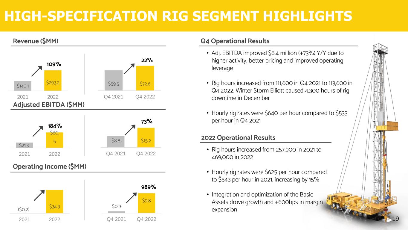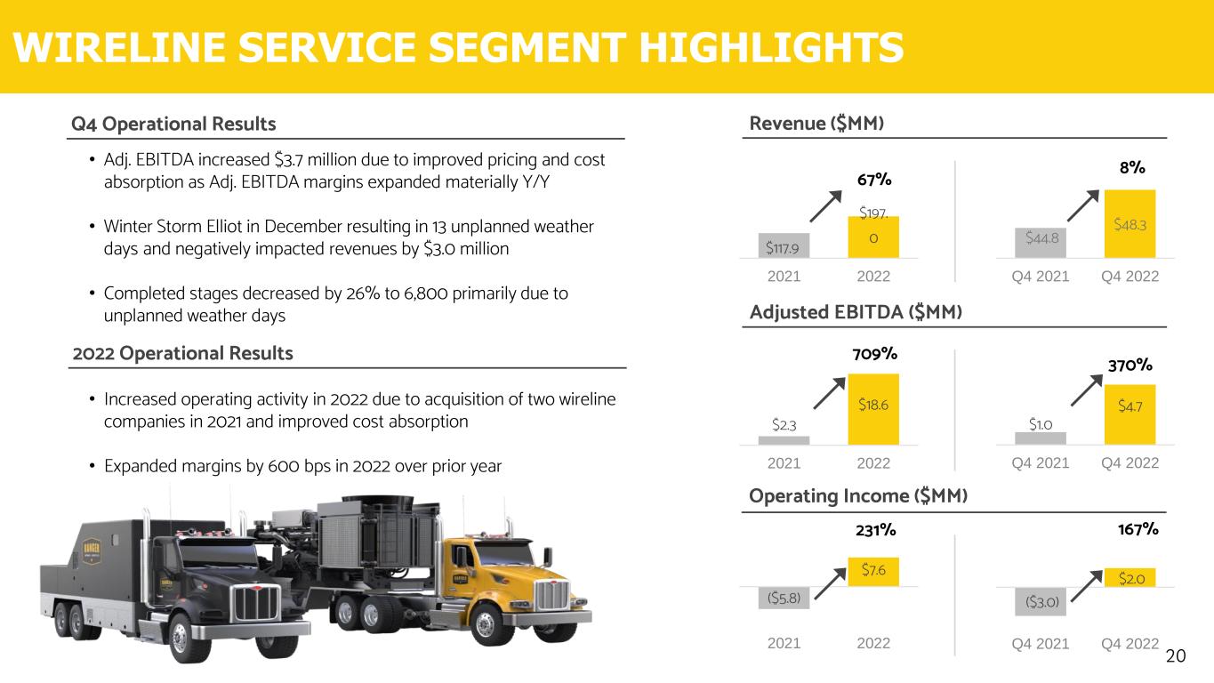 $0.9 $9.8 Q4 2021 Q4 2022 $59.5 $72.6 Q4 2021 Q4 2022 $8.8 $15.2 Q4 2021 Q4 2022 HIGH-SPECIFICATION RIG SEGMENT HIGHLIGHTS 19 22% Revenue ($MM) Adjusted EBITDA ($MM) 73% Operating Income ($MM) 989% • Adj. EBITDA improved $6.4 million (+73%) Y/Y due to higher activity, better pricing and improved operating leverage • Rig hours increased from 111,600 in Q4 2021 to 113,600 in Q4 2022. Winter Storm Elliott caused 4,300 hours of rig downtime in December • Hourly rig rates were $640 per hour compared to $533 per hour in Q4 2021 Q4 Operational Results ($0.2) $34.3 2021 2022 $140.1 $293.2 2021 2022 $21.3 $60. 5 2021 2022 109% 184% 2022 Operational Results • Rig hours increased from 257,900 in 2021 to 469,000 in 2022 • Hourly rig rates were $625 per hour compared to $543 per hour in 2021, increasing by 15% • Integration and optimization of the Basic Assets drove growth and +600bps in margin expansion