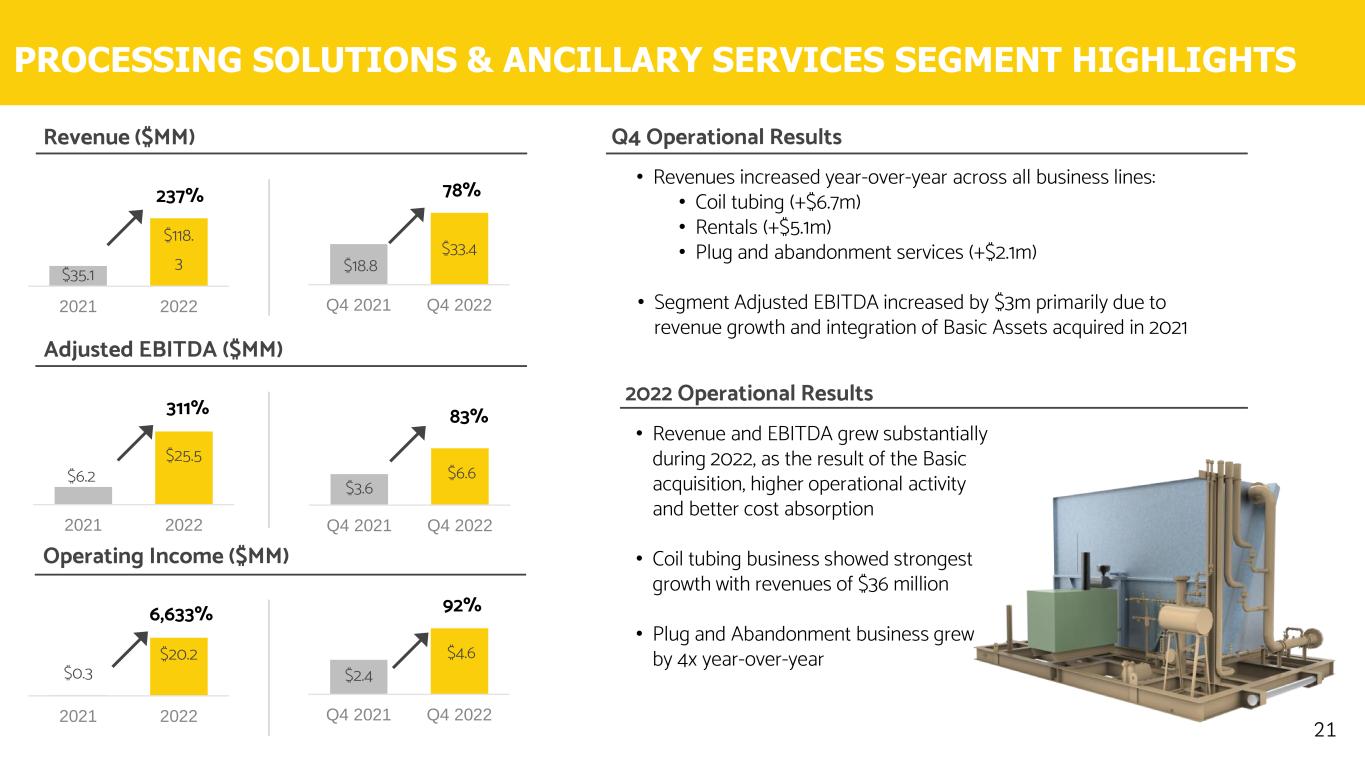 WIRELINE SERVICE SEGMENT HIGHLIGHTS 20 • Adj. EBITDA increased $3.7 million due to improved pricing and cost absorption as Adj. EBITDA margins expanded materially Y/Y • Winter Storm Elliot in December resulting in 13 unplanned weather days and negatively impacted revenues by $3.0 million • Completed stages decreased by 26% to 6,800 primarily due to unplanned weather days Q4 Operational Results ($3.0) $2.0 Q4 2021 Q4 2022 $1.0 $4.7 Q4 2021 Q4 2022 $44.8 $48.3 Q4 2021 Q4 2022 8% Revenue ($MM) Adjusted EBITDA ($MM) 370% Operating Income ($MM) ($5.8) $7.6 2021 2022 $2.3 $18.6 2021 2022 $117.9 $197. 0 2021 2022 67% 709%2022 Operational Results • Increased operating activity in 2022 due to acquisition of two wireline companies in 2021 and improved cost absorption • Expanded margins by 600 bps in 2022 over prior year 231% 167%