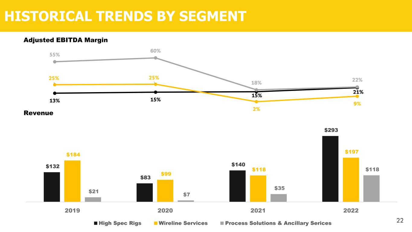 $2.4 $4.6 Q4 2021 Q4 2022 $0.3 $20.2 2021 2022 $3.6 $6.6 Q4 2021 Q4 2022 $18.8 $33.4 Q4 2021 Q4 2022 PROCESSING SOLUTIONS & ANCILLARY SERVICES SEGMENT HIGHLIGHTS 21 78% Revenue ($MM) Adjusted EBITDA ($MM) 83% Operating Income ($MM) 92% • Revenues increased year-over-year across all business lines: • Coil tubing (+$6.7m) • Rentals (+$5.1m) • Plug and abandonment services (+$2.1m) • Segment Adjusted EBITDA increased by $3m primarily due to revenue growth and integration of Basic Assets acquired in 2021 Q4 Operational Results $6.2 $25.5 2021 2022 $35.1 $118. 3 2021 2022 237% 311% 6,633% 2022 Operational Results • Revenue and EBITDA grew substantially during 2022, as the result of the Basic acquisition, higher operational activity and better cost absorption • Coil tubing business showed strongest growth with revenues of $36 million • Plug and Abandonment business grew by 4x year-over-year