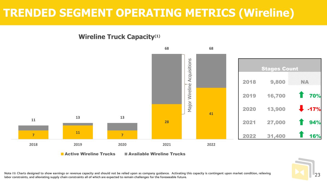7 11 7 28 41 11 13 13 68 68 2018 2019 2020 2021 2022 Active Wireline Trucks Available Wireline Trucks M a jo r W ir e lin e A cq u is it io n s TRENDED SEGMENT OPERATING METRICS (Wireline) 23 Wireline Truck Capacity(1) Note (1): Charts designed to show earnings or revenue capacity and should not be relied upon as company guidance. Activating this capacity is contingent upon market condition, relieving labor constraints, and alleviating supply chain constraints all of which are expected to remain challenges for the foreseeable future. Stages Count 2018 9,800 NA 2019 16,700 70% 2020 13,900 -17% 2021 27,000 94% 2022 31,400 16%