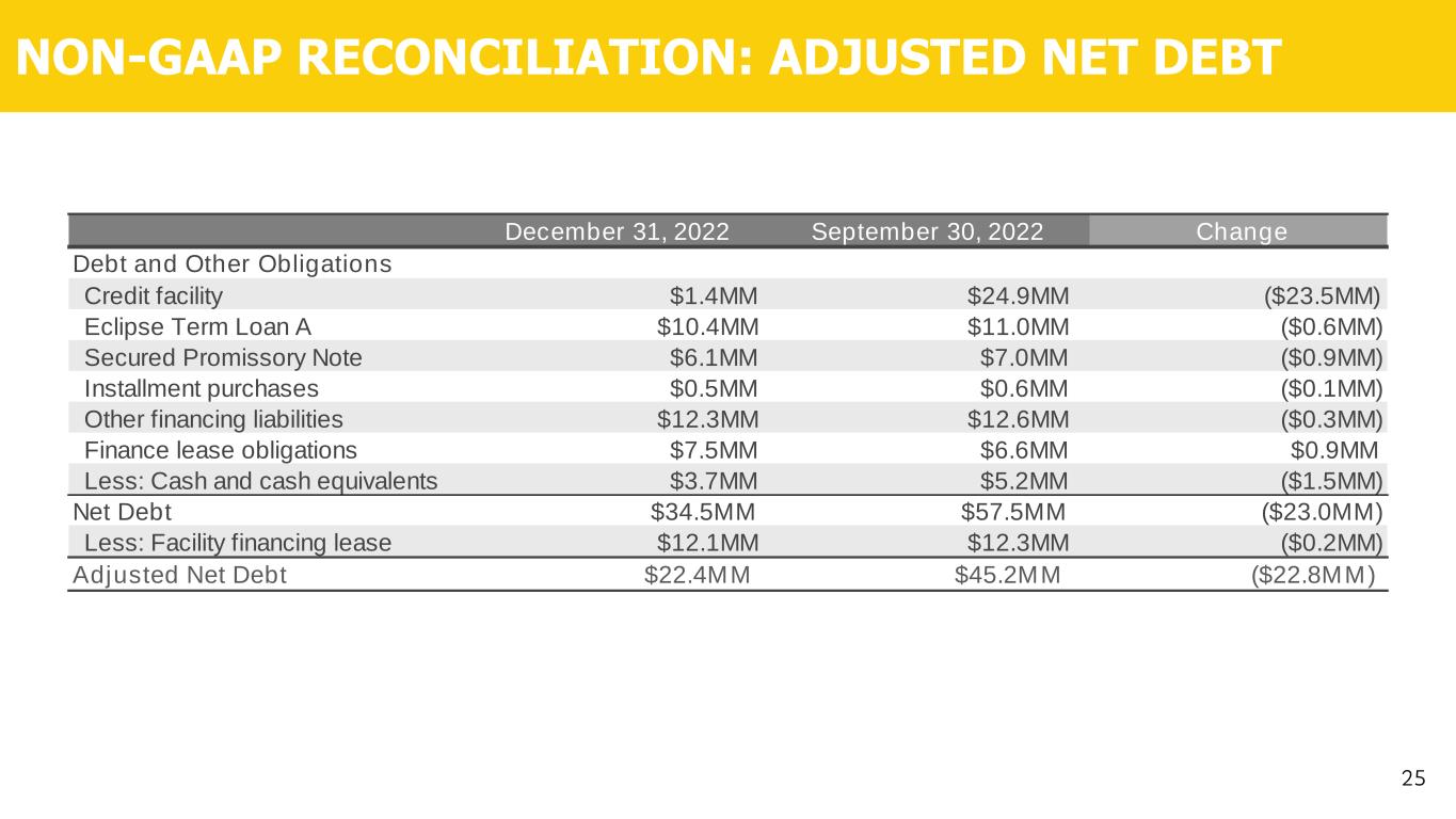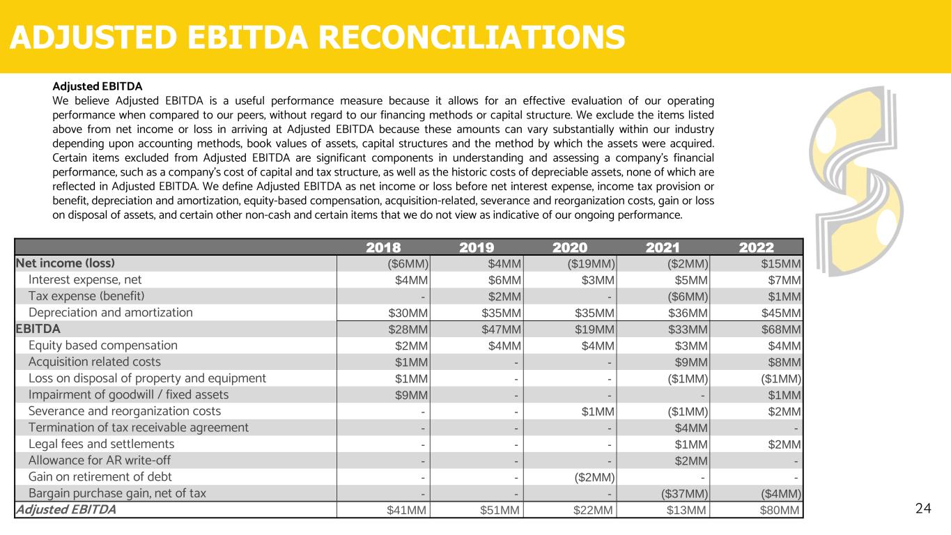 ADJUSTED EBITDA RECONCILIATIONS 24 Adjusted EBITDA We believe Adjusted EBITDA is a useful performance measure because it allows for an effective evaluation of our operating performance when compared to our peers, without regard to our financing methods or capital structure. We exclude the items listed above from net income or loss in arriving at Adjusted EBITDA because these amounts can vary substantially within our industry depending upon accounting methods, book values of assets, capital structures and the method by which the assets were acquired. Certain items excluded from Adjusted EBITDA are significant components in understanding and assessing a company’s financial performance, such as a company’s cost of capital and tax structure, as well as the historic costs of depreciable assets, none of which are reflected in Adjusted EBITDA. We define Adjusted EBITDA as net income or loss before net interest expense, income tax provision or benefit, depreciation and amortization, equity-based compensation, acquisition-related, severance and reorganization costs, gain or loss on disposal of assets, and certain other non-cash and certain items that we do not view as indicative of our ongoing performance. 2018 2019 2020 2021 2022 Net income (loss) ($6MM) $4MM ($19MM) ($2MM) $15MM Interest expense, net $4MM $6MM $3MM $5MM $7MM Tax expense (benefit) - $2MM - ($6MM) $1MM Depreciation and amortization $30MM $35MM $35MM $36MM $45MM EBITDA $28MM $47MM $19MM $33MM $68MM Equity based compensation $2MM $4MM $4MM $3MM $4MM Acquisition related costs $1MM - - $9MM $8MM Loss on disposal of property and equipment $1MM - - ($1MM) ($1MM) Impairment of goodwill / fixed assets $9MM - - - $1MM Severance and reorganization costs - - $1MM ($1MM) $2MM Termination of tax receivable agreement - - - $4MM - Legal fees and settlements - - - $1MM $2MM Allowance for AR write-off - - - $2MM - Gain on retirement of debt - - ($2MM) - - Bargain purchase gain, net of tax - - - ($37MM) ($4MM) Adjusted EBITDA $41MM $51MM $22MM $13MM $80MM