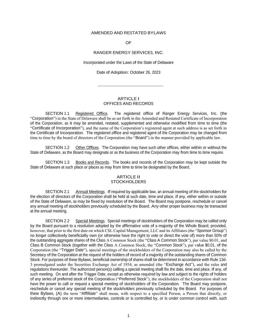 1 AMENDED AND RESTATED BYLAWS OF RANGER ENERGY SERVICES, INC. Incorporated under the Laws of the State of Delaware Date of Adoption: October 26, 2023 ARTICLE I OFFICES AND RECORDS SECTION 1.1 Registered Office. The registered office of Ranger Energy Services, Inc. (the “Corporation”) in the State of Delaware shall be as set forth in the Amended and Restated Certificate of Incorporation of the Corporation, as it may be amended, restated, supplemented and otherwise modified from time to time (the “Certificate of Incorporation”), and the name of the Corporation’s registered agent at such address is as set forth in the Certificate of Incorporation. The registered office and registered agent of the Corporation may be changed from time to time by the board of directors of the Corporation (the “Board”) in the manner provided by applicable law. SECTION 1.2 Other Offices. The Corporation may have such other offices, either within or without the State of Delaware, as the Board may designate or as the business of the Corporation may from time to time require. SECTION 1.3 Books and Records. The books and records of the Corporation may be kept outside the State of Delaware at such place or places as may from time to time be designated by the Board. ARTICLE II STOCKHOLDERS SECTION 2.1 Annual Meetings. If required by applicable law, an annual meeting of the stockholders for the election of directors of the Corporation shall be held at such date, time and place, if any, either within or outside of the State of Delaware, as may be fixed by resolution of the Board. The Board may postpone, reschedule or cancel any annual meeting of stockholders previously scheduled by the Board. Any other proper business may be transacted at the annual meeting. SECTION 2.2 Special Meetings. Special meetings of stockholders of the Corporation may be called only by the Board pursuant to a resolution adopted by the affirmative vote of a majority of the Whole Board; provided, however, that prior to the first date on which CSL Capital Management, LLC and its Affiliates (the “Sponsor Group”) no longer collectively beneficially own (or otherwise have the right to vote or direct the vote of) more than 50% of the outstanding aggregate shares of the Class A Common Stock (the “Class A Common Stock”), par value $0.01, and Class B Common Stock (together with the Class A Common Stock, the “Common Stock”), par value $0.01, of the Corporation (the “Trigger Date”), special meetings of the stockholders of the Corporation may also be called by the Secretary of the Corporation at the request of the holders of record of a majority of the outstanding shares of Common Stock. For purposes of these Bylaws, beneficial ownership of shares shall be determined in accordance with Rule 13d- 3 promulgated under the Securities Exchange Act of 1934, as amended (the “Exchange Act”), and the rules and regulations thereunder. The authorized person(s) calling a special meeting shall fix the date, time and place, if any, of such meeting. On and after the Trigger Date, except as otherwise required by law and subject to the rights of holders of any series of preferred stock of the Corporation (“Preferred Stock”), the stockholders of the Corporation shall not have the power to call or request a special meeting of stockholders of the Corporation. The Board may postpone, reschedule or cancel any special meeting of the stockholders previously scheduled by the Board. For purposes of these Bylaws, (A) the term “Affiliate” shall mean, with respect to a specified Person, a Person that directly, or indirectly through one or more intermediaries, controls or is controlled by, or is under common control with, such