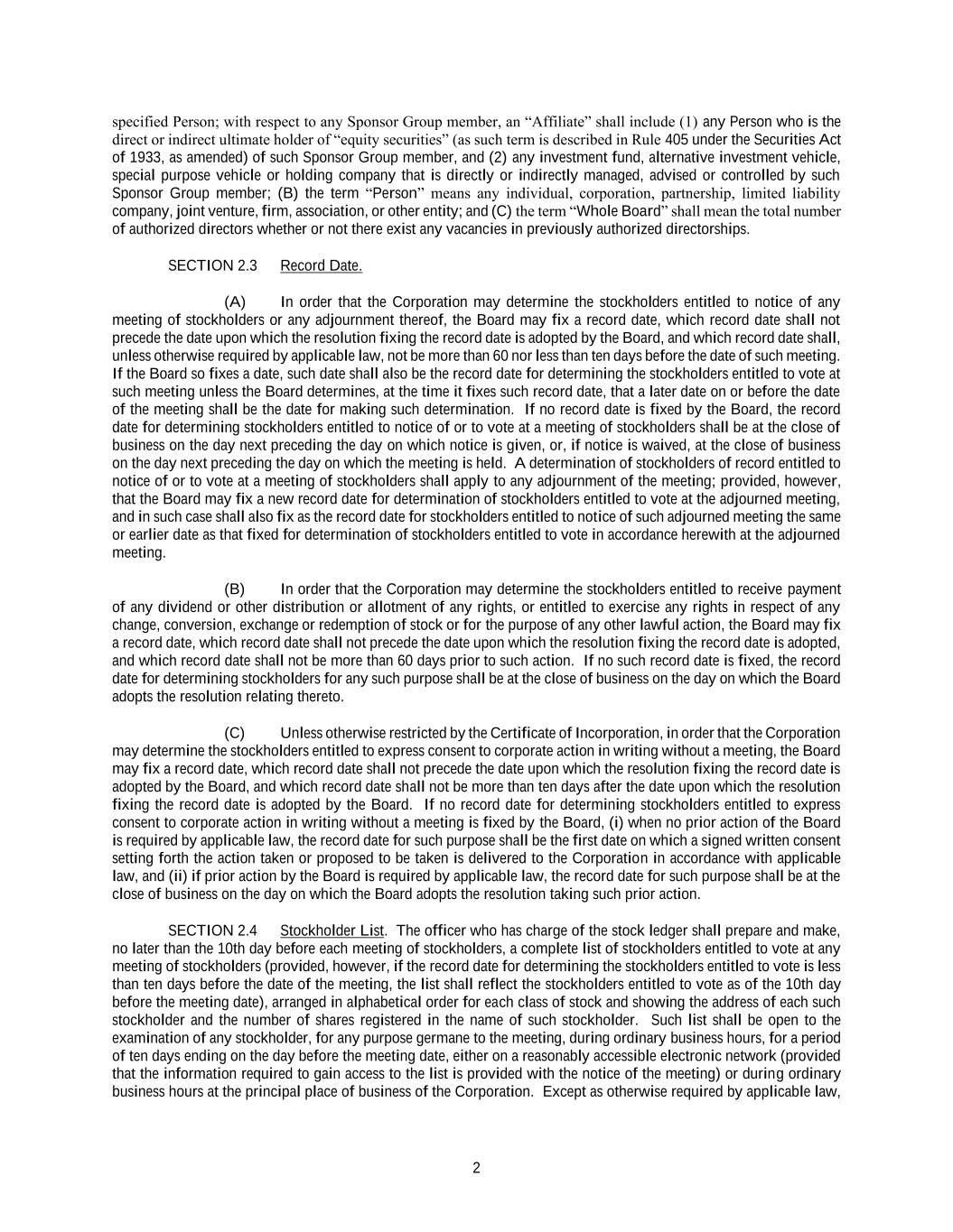 2 specified Person; with respect to any Sponsor Group member, an “Affiliate” shall include (1) any Person who is the direct or indirect ultimate holder of “equity securities” (as such term is described in Rule 405 under the Securities Act of 1933, as amended) of such Sponsor Group member, and (2) any investment fund, alternative investment vehicle, special purpose vehicle or holding company that is directly or indirectly managed, advised or controlled by such Sponsor Group member; (B) the term “Person” means any individual, corporation, partnership, limited liability company, joint venture, firm, association, or other entity; and (C) the term “Whole Board” shall mean the total number of authorized directors whether or not there exist any vacancies in previously authorized directorships. SECTION 2.3 Record Date. (A) In order that the Corporation may determine the stockholders entitled to notice of any meeting of stockholders or any adjournment thereof, the Board may fix a record date, which record date shall not precede the date upon which the resolution fixing the record date is adopted by the Board, and which record date shall, unless otherwise required by applicable law, not be more than 60 nor less than ten days before the date of such meeting. If the Board so fixes a date, such date shall also be the record date for determining the stockholders entitled to vote at such meeting unless the Board determines, at the time it fixes such record date, that a later date on or before the date of the meeting shall be the date for making such determination. If no record date is fixed by the Board, the record date for determining stockholders entitled to notice of or to vote at a meeting of stockholders shall be at the close of business on the day next preceding the day on which notice is given, or, if notice is waived, at the close of business on the day next preceding the day on which the meeting is held. A determination of stockholders of record entitled to notice of or to vote at a meeting of stockholders shall apply to any adjournment of the meeting; provided, however, that the Board may fix a new record date for determination of stockholders entitled to vote at the adjourned meeting, and in such case shall also fix as the record date for stockholders entitled to notice of such adjourned meeting the same or earlier date as that fixed for determination of stockholders entitled to vote in accordance herewith at the adjourned meeting. (B) In order that the Corporation may determine the stockholders entitled to receive payment of any dividend or other distribution or allotment of any rights, or entitled to exercise any rights in respect of any change, conversion, exchange or redemption of stock or for the purpose of any other lawful action, the Board may fix a record date, which record date shall not precede the date upon which the resolution fixing the record date is adopted, and which record date shall not be more than 60 days prior to such action. If no such record date is fixed, the record date for determining stockholders for any such purpose shall be at the close of business on the day on which the Board adopts the resolution relating thereto. (C) Unless otherwise restricted by the Certificate of Incorporation, in order that the Corporation may determine the stockholders entitled to express consent to corporate action in writing without a meeting, the Board may fix a record date, which record date shall not precede the date upon which the resolution fixing the record date is adopted by the Board, and which record date shall not be more than ten days after the date upon which the resolution fixing the record date is adopted by the Board. If no record date for determining stockholders entitled to express consent to corporate action in writing without a meeting is fixed by the Board, (i) when no prior action of the Board is required by applicable law, the record date for such purpose shall be the first date on which a signed written consent setting forth the action taken or proposed to be taken is delivered to the Corporation in accordance with applicable law, and (ii) if prior action by the Board is required by applicable law, the record date for such purpose shall be at the close of business on the day on which the Board adopts the resolution taking such prior action. SECTION 2.4 Stockholder List. The officer who has charge of the stock ledger shall prepare and make, no later than the 10th day before each meeting of stockholders, a complete list of stockholders entitled to vote at any meeting of stockholders (provided, however, if the record date for determining the stockholders entitled to vote is less than ten days before the date of the meeting, the list shall reflect the stockholders entitled to vote as of the 10th day before the meeting date), arranged in alphabetical order for each class of stock and showing the address of each such stockholder and the number of shares registered in the name of such stockholder. Such list shall be open to the examination of any stockholder, for any purpose germane to the meeting, during ordinary business hours, for a period of ten days ending on the day before the meeting date, either on a reasonably accessible electronic network (provided that the information required to gain access to the list is provided with the notice of the meeting) or during ordinary business hours at the principal place of business of the Corporation. Except as otherwise required by applicable law,