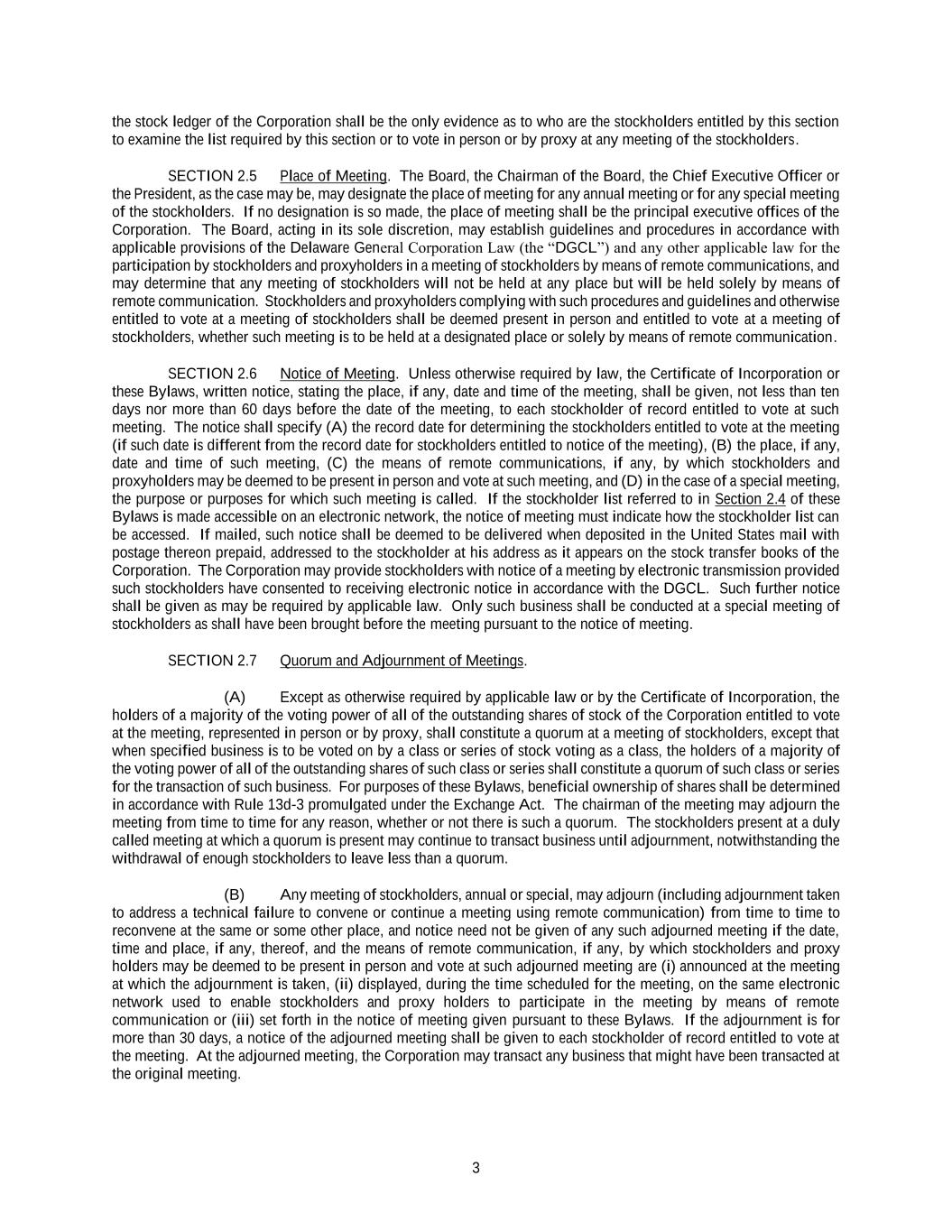3 the stock ledger of the Corporation shall be the only evidence as to who are the stockholders entitled by this section to examine the list required by this section or to vote in person or by proxy at any meeting of the stockholders. SECTION 2.5 Place of Meeting. The Board, the Chairman of the Board, the Chief Executive Officer or the President, as the case may be, may designate the place of meeting for any annual meeting or for any special meeting of the stockholders. If no designation is so made, the place of meeting shall be the principal executive offices of the Corporation. The Board, acting in its sole discretion, may establish guidelines and procedures in accordance with applicable provisions of the Delaware General Corporation Law (the “DGCL”) and any other applicable law for the participation by stockholders and proxyholders in a meeting of stockholders by means of remote communications, and may determine that any meeting of stockholders will not be held at any place but will be held solely by means of remote communication. Stockholders and proxyholders complying with such procedures and guidelines and otherwise entitled to vote at a meeting of stockholders shall be deemed present in person and entitled to vote at a meeting of stockholders, whether such meeting is to be held at a designated place or solely by means of remote communication. SECTION 2.6 Notice of Meeting. Unless otherwise required by law, the Certificate of Incorporation or these Bylaws, written notice, stating the place, if any, date and time of the meeting, shall be given, not less than ten days nor more than 60 days before the date of the meeting, to each stockholder of record entitled to vote at such meeting. The notice shall specify (A) the record date for determining the stockholders entitled to vote at the meeting (if such date is different from the record date for stockholders entitled to notice of the meeting), (B) the place, if any, date and time of such meeting, (C) the means of remote communications, if any, by which stockholders and proxyholders may be deemed to be present in person and vote at such meeting, and (D) in the case of a special meeting, the purpose or purposes for which such meeting is called. If the stockholder list referred to in Section 2.4 of these Bylaws is made accessible on an electronic network, the notice of meeting must indicate how the stockholder list can be accessed. If mailed, such notice shall be deemed to be delivered when deposited in the United States mail with postage thereon prepaid, addressed to the stockholder at his address as it appears on the stock transfer books of the Corporation. The Corporation may provide stockholders with notice of a meeting by electronic transmission provided such stockholders have consented to receiving electronic notice in accordance with the DGCL. Such further notice shall be given as may be required by applicable law. Only such business shall be conducted at a special meeting of stockholders as shall have been brought before the meeting pursuant to the notice of meeting. SECTION 2.7 Quorum and Adjournment of Meetings. (A) Except as otherwise required by applicable law or by the Certificate of Incorporation, the holders of a majority of the voting power of all of the outstanding shares of stock of the Corporation entitled to vote at the meeting, represented in person or by proxy, shall constitute a quorum at a meeting of stockholders, except that when specified business is to be voted on by a class or series of stock voting as a class, the holders of a majority of the voting power of all of the outstanding shares of such class or series shall constitute a quorum of such class or series for the transaction of such business. For purposes of these Bylaws, beneficial ownership of shares shall be determined in accordance with Rule 13d-3 promulgated under the Exchange Act. The chairman of the meeting may adjourn the meeting from time to time for any reason, whether or not there is such a quorum. The stockholders present at a duly called meeting at which a quorum is present may continue to transact business until adjournment, notwithstanding the withdrawal of enough stockholders to leave less than a quorum. (B) Any meeting of stockholders, annual or special, may adjourn (including adjournment taken to address a technical failure to convene or continue a meeting using remote communication) from time to time to reconvene at the same or some other place, and notice need not be given of any such adjourned meeting if the date, time and place, if any, thereof, and the means of remote communication, if any, by which stockholders and proxy holders may be deemed to be present in person and vote at such adjourned meeting are (i) announced at the meeting at which the adjournment is taken, (ii) displayed, during the time scheduled for the meeting, on the same electronic network used to enable stockholders and proxy holders to participate in the meeting by means of remote communication or (iii) set forth in the notice of meeting given pursuant to these Bylaws. If the adjournment is for more than 30 days, a notice of the adjourned meeting shall be given to each stockholder of record entitled to vote at the meeting. At the adjourned meeting, the Corporation may transact any business that might have been transacted at the original meeting.