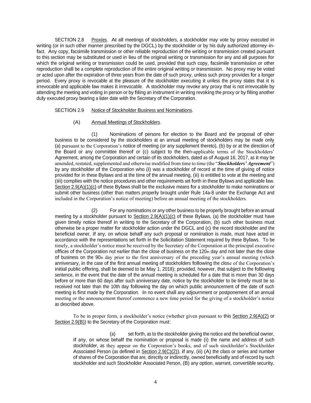 4 SECTION 2.8 Proxies. At all meetings of stockholders, a stockholder may vote by proxy executed in writing (or in such other manner prescribed by the DGCL) by the stockholder or by his duly authorized attorney-in- fact. Any copy, facsimile transmission or other reliable reproduction of the writing or transmission created pursuant to this section may be substituted or used in lieu of the original writing or transmission for any and all purposes for which the original writing or transmission could be used, provided that such copy, facsimile transmission or other reproduction shall be a complete reproduction of the entire original writing or transmission. No proxy may be voted or acted upon after the expiration of three years from the date of such proxy, unless such proxy provides for a longer period. Every proxy is revocable at the pleasure of the stockholder executing it unless the proxy states that it is irrevocable and applicable law makes it irrevocable. A stockholder may revoke any proxy that is not irrevocable by attending the meeting and voting in person or by filing an instrument in writing revoking the proxy or by filing another duly executed proxy bearing a later date with the Secretary of the Corporation. SECTION 2.9 Notice of Stockholder Business and Nominations. (A) Annual Meetings of Stockholders. (1) Nominations of persons for election to the Board and the proposal of other business to be considered by the stockholders at an annual meeting of stockholders may be made only (a) pursuant to the Corporation’s notice of meeting (or any supplement thereto), (b) by or at the direction of the Board or any committee thereof or (c) subject to the then-applicable terms of the Stockholders’ Agreement, among the Corporation and certain of its stockholders, dated as of August 16, 2017, as it may be amended, restated, supplemented and otherwise modified from time to time (the “Stockholders’ Agreement”) by any stockholder of the Corporation who (i) was a stockholder of record at the time of giving of notice provided for in these Bylaws and at the time of the annual meeting, (ii) is entitled to vote at the meeting and (iii) complies with the notice procedures and other requirements set forth in these Bylaws and applicable law. Section 2.9(A)(1)(c) of these Bylaws shall be the exclusive means for a stockholder to make nominations or submit other business (other than matters properly brought under Rule 14a-8 under the Exchange Act and included in the Corporation’s notice of meeting) before an annual meeting of the stockholders. (2) For any nominations or any other business to be properly brought before an annual meeting by a stockholder pursuant to Section 2.9(A)(1)(c) of these Bylaws, (a) the stockholder must have given timely notice thereof in writing to the Secretary of the Corporation, (b) such other business must otherwise be a proper matter for stockholder action under the DGCL and (c) the record stockholder and the beneficial owner, if any, on whose behalf any such proposal or nomination is made, must have acted in accordance with the representations set forth in the Solicitation Statement required by these Bylaws. To be timely, a stockholder’s notice must be received by the Secretary of the Corporation at the principal executive offices of the Corporation not earlier than the close of business on the 120th day and not later than the close of business on the 90th day prior to the first anniversary of the preceding year’s annual meeting (which anniversary, in the case of the first annual meeting of stockholders following the close of the Corporation’s initial public offering, shall be deemed to be May 1, 2018); provided, however, that subject to the following sentence, in the event that the date of the annual meeting is scheduled for a date that is more than 30 days before or more than 60 days after such anniversary date, notice by the stockholder to be timely must be so received not later than the 10th day following the day on which public announcement of the date of such meeting is first made by the Corporation. In no event shall any adjournment or postponement of an annual meeting or the announcement thereof commence a new time period for the giving of a stockholder’s notice as described above. To be in proper form, a stockholder’s notice (whether given pursuant to this Section 2.9(A)(2) or Section 2.9(B)) to the Secretary of the Corporation must: (a) set forth, as to the stockholder giving the notice and the beneficial owner, if any, on whose behalf the nomination or proposal is made (i) the name and address of such stockholder, as they appear on the Corporation’s books, and of such stockholder’s Stockholder Associated Person (as defined in Section 2.9(C)(2)), if any, (ii) (A) the class or series and number of shares of the Corporation that are, directly or indirectly, owned beneficially and of record by such stockholder and such Stockholder Associated Person, (B) any option, warrant, convertible security,
