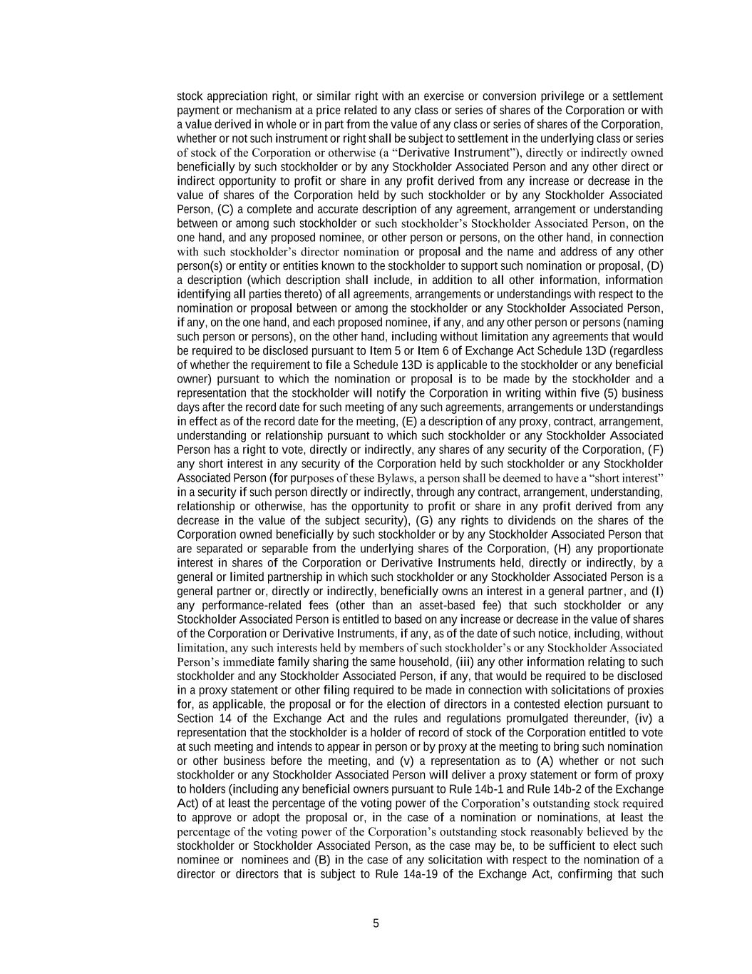 5 stock appreciation right, or similar right with an exercise or conversion privilege or a settlement payment or mechanism at a price related to any class or series of shares of the Corporation or with a value derived in whole or in part from the value of any class or series of shares of the Corporation, whether or not such instrument or right shall be subject to settlement in the underlying class or series of stock of the Corporation or otherwise (a “Derivative Instrument”), directly or indirectly owned beneficially by such stockholder or by any Stockholder Associated Person and any other direct or indirect opportunity to profit or share in any profit derived from any increase or decrease in the value of shares of the Corporation held by such stockholder or by any Stockholder Associated Person, (C) a complete and accurate description of any agreement, arrangement or understanding between or among such stockholder or such stockholder’s Stockholder Associated Person, on the one hand, and any proposed nominee, or other person or persons, on the other hand, in connection with such stockholder’s director nomination or proposal and the name and address of any other person(s) or entity or entities known to the stockholder to support such nomination or proposal, (D) a description (which description shall include, in addition to all other information, information identifying all parties thereto) of all agreements, arrangements or understandings with respect to the nomination or proposal between or among the stockholder or any Stockholder Associated Person, if any, on the one hand, and each proposed nominee, if any, and any other person or persons (naming such person or persons), on the other hand, including without limitation any agreements that would be required to be disclosed pursuant to Item 5 or Item 6 of Exchange Act Schedule 13D (regardless of whether the requirement to file a Schedule 13D is applicable to the stockholder or any beneficial owner) pursuant to which the nomination or proposal is to be made by the stockholder and a representation that the stockholder will notify the Corporation in writing within five (5) business days after the record date for such meeting of any such agreements, arrangements or understandings in effect as of the record date for the meeting, (E) a description of any proxy, contract, arrangement, understanding or relationship pursuant to which such stockholder or any Stockholder Associated Person has a right to vote, directly or indirectly, any shares of any security of the Corporation, (F) any short interest in any security of the Corporation held by such stockholder or any Stockholder Associated Person (for purposes of these Bylaws, a person shall be deemed to have a “short interest” in a security if such person directly or indirectly, through any contract, arrangement, understanding, relationship or otherwise, has the opportunity to profit or share in any profit derived from any decrease in the value of the subject security), (G) any rights to dividends on the shares of the Corporation owned beneficially by such stockholder or by any Stockholder Associated Person that are separated or separable from the underlying shares of the Corporation, (H) any proportionate interest in shares of the Corporation or Derivative Instruments held, directly or indirectly, by a general or limited partnership in which such stockholder or any Stockholder Associated Person is a general partner or, directly or indirectly, beneficially owns an interest in a general partner, and (I) any performance-related fees (other than an asset-based fee) that such stockholder or any Stockholder Associated Person is entitled to based on any increase or decrease in the value of shares of the Corporation or Derivative Instruments, if any, as of the date of such notice, including, without limitation, any such interests held by members of such stockholder’s or any Stockholder Associated Person’s immediate family sharing the same household, (iii) any other information relating to such stockholder and any Stockholder Associated Person, if any, that would be required to be disclosed in a proxy statement or other filing required to be made in connection with solicitations of proxies for, as applicable, the proposal or for the election of directors in a contested election pursuant to Section 14 of the Exchange Act and the rules and regulations promulgated thereunder, (iv) a representation that the stockholder is a holder of record of stock of the Corporation entitled to vote at such meeting and intends to appear in person or by proxy at the meeting to bring such nomination or other business before the meeting, and (v) a representation as to (A) whether or not such stockholder or any Stockholder Associated Person will deliver a proxy statement or form of proxy to holders (including any beneficial owners pursuant to Rule 14b-1 and Rule 14b-2 of the Exchange Act) of at least the percentage of the voting power of the Corporation’s outstanding stock required to approve or adopt the proposal or, in the case of a nomination or nominations, at least the percentage of the voting power of the Corporation’s outstanding stock reasonably believed by the stockholder or Stockholder Associated Person, as the case may be, to be sufficient to elect such nominee or nominees and (B) in the case of any solicitation with respect to the nomination of a director or directors that is subject to Rule 14a-19 of the Exchange Act, confirming that such