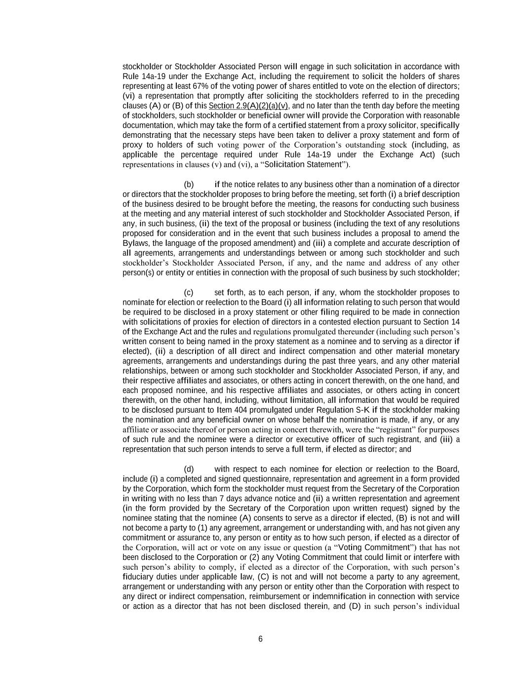 6 stockholder or Stockholder Associated Person will engage in such solicitation in accordance with Rule 14a-19 under the Exchange Act, including the requirement to solicit the holders of shares representing at least 67% of the voting power of shares entitled to vote on the election of directors; (vi) a representation that promptly after soliciting the stockholders referred to in the preceding clauses (A) or (B) of this Section 2.9(A)(2)(a)(v), and no later than the tenth day before the meeting of stockholders, such stockholder or beneficial owner will provide the Corporation with reasonable documentation, which may take the form of a certified statement from a proxy solicitor, specifically demonstrating that the necessary steps have been taken to deliver a proxy statement and form of proxy to holders of such voting power of the Corporation’s outstanding stock (including, as applicable the percentage required under Rule 14a-19 under the Exchange Act) (such representations in clauses (v) and (vi), a “Solicitation Statement”). (b) if the notice relates to any business other than a nomination of a director or directors that the stockholder proposes to bring before the meeting, set forth (i) a brief description of the business desired to be brought before the meeting, the reasons for conducting such business at the meeting and any material interest of such stockholder and Stockholder Associated Person, if any, in such business, (ii) the text of the proposal or business (including the text of any resolutions proposed for consideration and in the event that such business includes a proposal to amend the Bylaws, the language of the proposed amendment) and (iii) a complete and accurate description of all agreements, arrangements and understandings between or among such stockholder and such stockholder’s Stockholder Associated Person, if any, and the name and address of any other person(s) or entity or entities in connection with the proposal of such business by such stockholder; (c) set forth, as to each person, if any, whom the stockholder proposes to nominate for election or reelection to the Board (i) all information relating to such person that would be required to be disclosed in a proxy statement or other filing required to be made in connection with solicitations of proxies for election of directors in a contested election pursuant to Section 14 of the Exchange Act and the rules and regulations promulgated thereunder (including such person’s written consent to being named in the proxy statement as a nominee and to serving as a director if elected), (ii) a description of all direct and indirect compensation and other material monetary agreements, arrangements and understandings during the past three years, and any other material relationships, between or among such stockholder and Stockholder Associated Person, if any, and their respective affiliates and associates, or others acting in concert therewith, on the one hand, and each proposed nominee, and his respective affiliates and associates, or others acting in concert therewith, on the other hand, including, without limitation, all information that would be required to be disclosed pursuant to Item 404 promulgated under Regulation S-K if the stockholder making the nomination and any beneficial owner on whose behalf the nomination is made, if any, or any affiliate or associate thereof or person acting in concert therewith, were the “registrant” for purposes of such rule and the nominee were a director or executive officer of such registrant, and (iii) a representation that such person intends to serve a full term, if elected as director; and (d) with respect to each nominee for election or reelection to the Board, include (i) a completed and signed questionnaire, representation and agreement in a form provided by the Corporation, which form the stockholder must request from the Secretary of the Corporation in writing with no less than 7 days advance notice and (ii) a written representation and agreement (in the form provided by the Secretary of the Corporation upon written request) signed by the nominee stating that the nominee (A) consents to serve as a director if elected, (B) is not and will not become a party to (1) any agreement, arrangement or understanding with, and has not given any commitment or assurance to, any person or entity as to how such person, if elected as a director of the Corporation, will act or vote on any issue or question (a “Voting Commitment”) that has not been disclosed to the Corporation or (2) any Voting Commitment that could limit or interfere with such person’s ability to comply, if elected as a director of the Corporation, with such person’s fiduciary duties under applicable law, (C) is not and will not become a party to any agreement, arrangement or understanding with any person or entity other than the Corporation with respect to any direct or indirect compensation, reimbursement or indemnification in connection with service or action as a director that has not been disclosed therein, and (D) in such person’s individual
