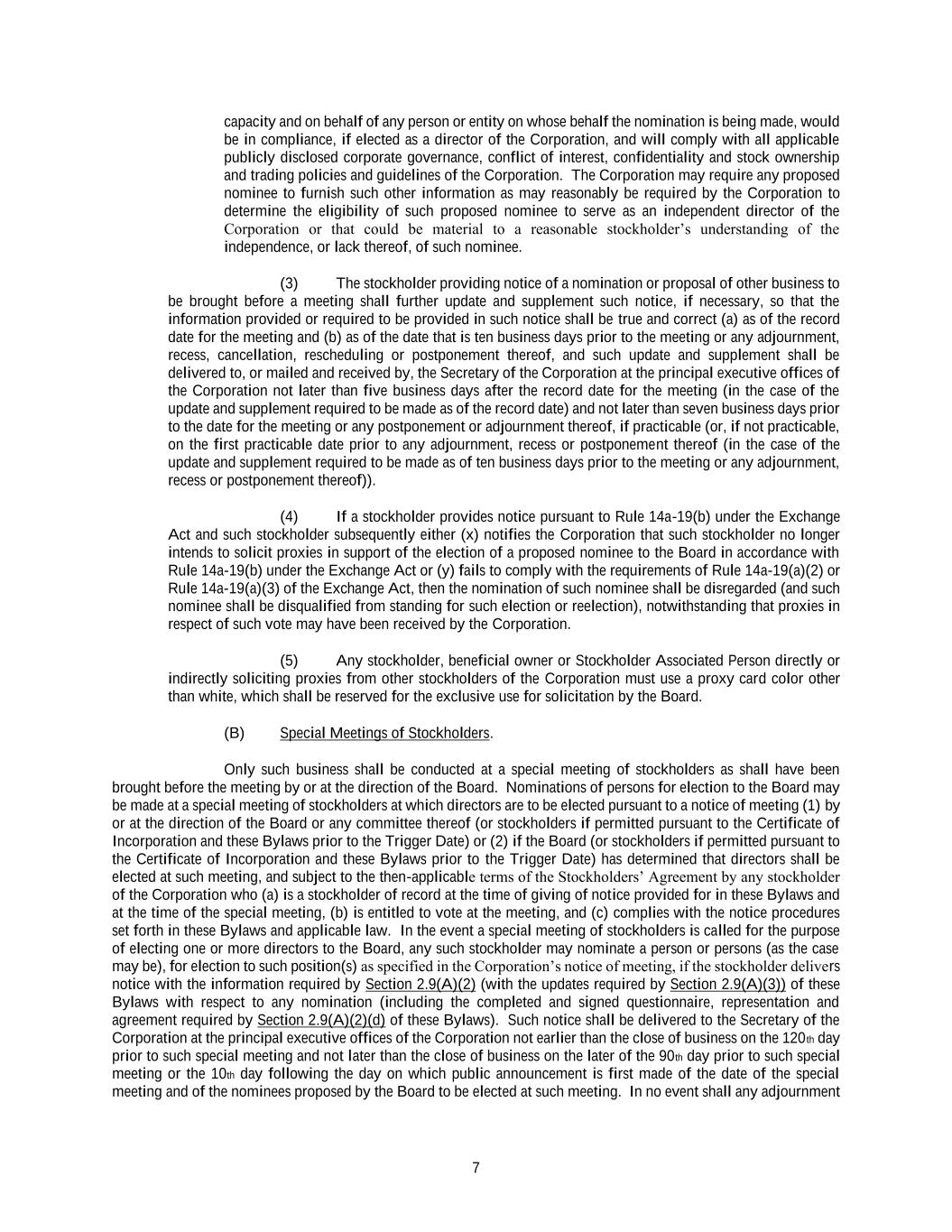 7 capacity and on behalf of any person or entity on whose behalf the nomination is being made, would be in compliance, if elected as a director of the Corporation, and will comply with all applicable publicly disclosed corporate governance, conflict of interest, confidentiality and stock ownership and trading policies and guidelines of the Corporation. The Corporation may require any proposed nominee to furnish such other information as may reasonably be required by the Corporation to determine the eligibility of such proposed nominee to serve as an independent director of the Corporation or that could be material to a reasonable stockholder’s understanding of the independence, or lack thereof, of such nominee. (3) The stockholder providing notice of a nomination or proposal of other business to be brought before a meeting shall further update and supplement such notice, if necessary, so that the information provided or required to be provided in such notice shall be true and correct (a) as of the record date for the meeting and (b) as of the date that is ten business days prior to the meeting or any adjournment, recess, cancellation, rescheduling or postponement thereof, and such update and supplement shall be delivered to, or mailed and received by, the Secretary of the Corporation at the principal executive offices of the Corporation not later than five business days after the record date for the meeting (in the case of the update and supplement required to be made as of the record date) and not later than seven business days prior to the date for the meeting or any postponement or adjournment thereof, if practicable (or, if not practicable, on the first practicable date prior to any adjournment, recess or postponement thereof (in the case of the update and supplement required to be made as of ten business days prior to the meeting or any adjournment, recess or postponement thereof)). (4) If a stockholder provides notice pursuant to Rule 14a-19(b) under the Exchange Act and such stockholder subsequently either (x) notifies the Corporation that such stockholder no longer intends to solicit proxies in support of the election of a proposed nominee to the Board in accordance with Rule 14a-19(b) under the Exchange Act or (y) fails to comply with the requirements of Rule 14a-19(a)(2) or Rule 14a-19(a)(3) of the Exchange Act, then the nomination of such nominee shall be disregarded (and such nominee shall be disqualified from standing for such election or reelection), notwithstanding that proxies in respect of such vote may have been received by the Corporation. (5) Any stockholder, beneficial owner or Stockholder Associated Person directly or indirectly soliciting proxies from other stockholders of the Corporation must use a proxy card color other than white, which shall be reserved for the exclusive use for solicitation by the Board. (B) Special Meetings of Stockholders. Only such business shall be conducted at a special meeting of stockholders as shall have been brought before the meeting by or at the direction of the Board. Nominations of persons for election to the Board may be made at a special meeting of stockholders at which directors are to be elected pursuant to a notice of meeting (1) by or at the direction of the Board or any committee thereof (or stockholders if permitted pursuant to the Certificate of Incorporation and these Bylaws prior to the Trigger Date) or (2) if the Board (or stockholders if permitted pursuant to the Certificate of Incorporation and these Bylaws prior to the Trigger Date) has determined that directors shall be elected at such meeting, and subject to the then-applicable terms of the Stockholders’ Agreement by any stockholder of the Corporation who (a) is a stockholder of record at the time of giving of notice provided for in these Bylaws and at the time of the special meeting, (b) is entitled to vote at the meeting, and (c) complies with the notice procedures set forth in these Bylaws and applicable law. In the event a special meeting of stockholders is called for the purpose of electing one or more directors to the Board, any such stockholder may nominate a person or persons (as the case may be), for election to such position(s) as specified in the Corporation’s notice of meeting, if the stockholder delivers notice with the information required by Section 2.9(A)(2) (with the updates required by Section 2.9(A)(3)) of these Bylaws with respect to any nomination (including the completed and signed questionnaire, representation and agreement required by Section 2.9(A)(2)(d) of these Bylaws). Such notice shall be delivered to the Secretary of the Corporation at the principal executive offices of the Corporation not earlier than the close of business on the 120th day prior to such special meeting and not later than the close of business on the later of the 90th day prior to such special meeting or the 10th day following the day on which public announcement is first made of the date of the special meeting and of the nominees proposed by the Board to be elected at such meeting. In no event shall any adjournment
