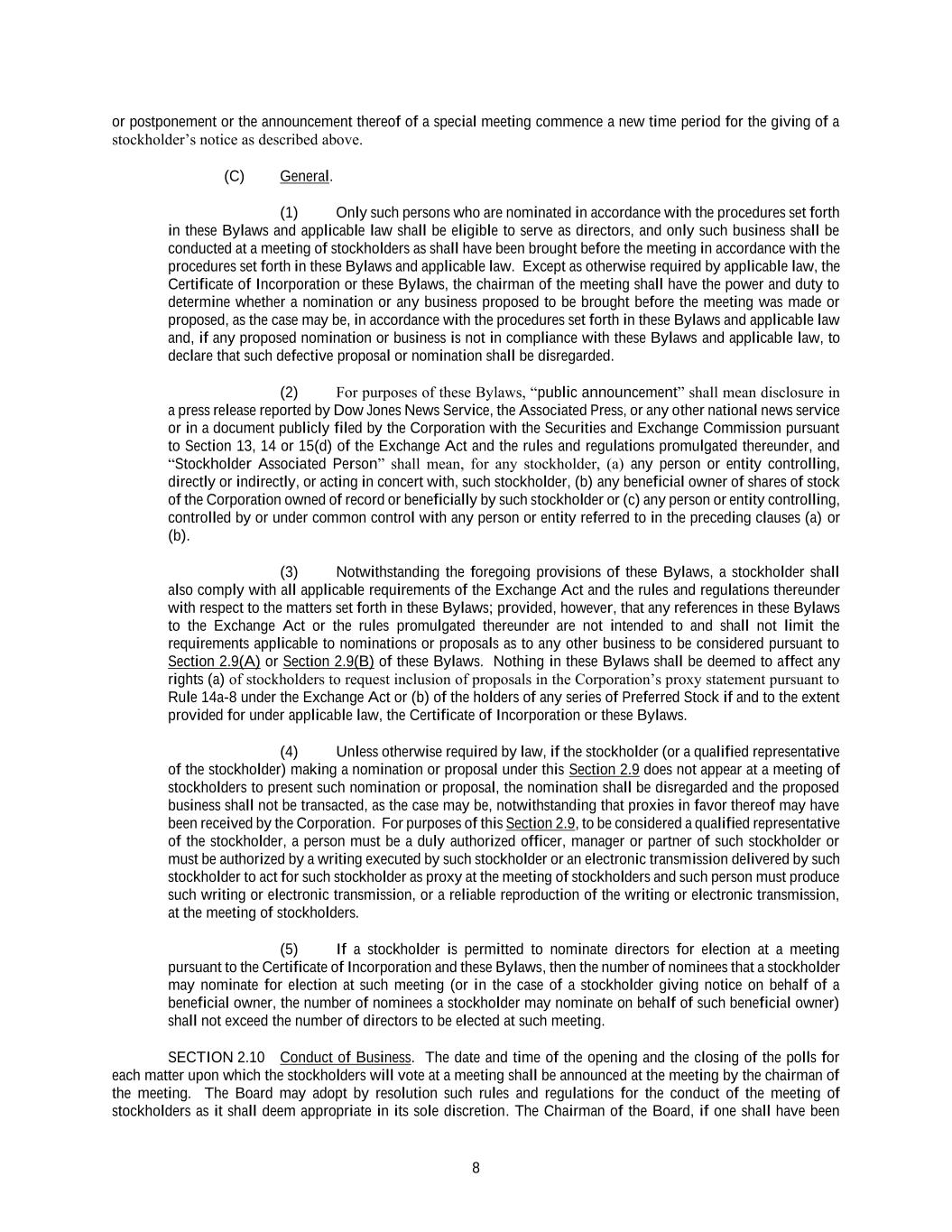 8 or postponement or the announcement thereof of a special meeting commence a new time period for the giving of a stockholder’s notice as described above. (C) General. (1) Only such persons who are nominated in accordance with the procedures set forth in these Bylaws and applicable law shall be eligible to serve as directors, and only such business shall be conducted at a meeting of stockholders as shall have been brought before the meeting in accordance with the procedures set forth in these Bylaws and applicable law. Except as otherwise required by applicable law, the Certificate of Incorporation or these Bylaws, the chairman of the meeting shall have the power and duty to determine whether a nomination or any business proposed to be brought before the meeting was made or proposed, as the case may be, in accordance with the procedures set forth in these Bylaws and applicable law and, if any proposed nomination or business is not in compliance with these Bylaws and applicable law, to declare that such defective proposal or nomination shall be disregarded. (2) For purposes of these Bylaws, “public announcement” shall mean disclosure in a press release reported by Dow Jones News Service, the Associated Press, or any other national news service or in a document publicly filed by the Corporation with the Securities and Exchange Commission pursuant to Section 13, 14 or 15(d) of the Exchange Act and the rules and regulations promulgated thereunder, and “Stockholder Associated Person” shall mean, for any stockholder, (a) any person or entity controlling, directly or indirectly, or acting in concert with, such stockholder, (b) any beneficial owner of shares of stock of the Corporation owned of record or beneficially by such stockholder or (c) any person or entity controlling, controlled by or under common control with any person or entity referred to in the preceding clauses (a) or (b). (3) Notwithstanding the foregoing provisions of these Bylaws, a stockholder shall also comply with all applicable requirements of the Exchange Act and the rules and regulations thereunder with respect to the matters set forth in these Bylaws; provided, however, that any references in these Bylaws to the Exchange Act or the rules promulgated thereunder are not intended to and shall not limit the requirements applicable to nominations or proposals as to any other business to be considered pursuant to Section 2.9(A) or Section 2.9(B) of these Bylaws. Nothing in these Bylaws shall be deemed to affect any rights (a) of stockholders to request inclusion of proposals in the Corporation’s proxy statement pursuant to Rule 14a-8 under the Exchange Act or (b) of the holders of any series of Preferred Stock if and to the extent provided for under applicable law, the Certificate of Incorporation or these Bylaws. (4) Unless otherwise required by law, if the stockholder (or a qualified representative of the stockholder) making a nomination or proposal under this Section 2.9 does not appear at a meeting of stockholders to present such nomination or proposal, the nomination shall be disregarded and the proposed business shall not be transacted, as the case may be, notwithstanding that proxies in favor thereof may have been received by the Corporation. For purposes of this Section 2.9, to be considered a qualified representative of the stockholder, a person must be a duly authorized officer, manager or partner of such stockholder or must be authorized by a writing executed by such stockholder or an electronic transmission delivered by such stockholder to act for such stockholder as proxy at the meeting of stockholders and such person must produce such writing or electronic transmission, or a reliable reproduction of the writing or electronic transmission, at the meeting of stockholders. (5) If a stockholder is permitted to nominate directors for election at a meeting pursuant to the Certificate of Incorporation and these Bylaws, then the number of nominees that a stockholder may nominate for election at such meeting (or in the case of a stockholder giving notice on behalf of a beneficial owner, the number of nominees a stockholder may nominate on behalf of such beneficial owner) shall not exceed the number of directors to be elected at such meeting. SECTION 2.10 Conduct of Business. The date and time of the opening and the closing of the polls for each matter upon which the stockholders will vote at a meeting shall be announced at the meeting by the chairman of the meeting. The Board may adopt by resolution such rules and regulations for the conduct of the meeting of stockholders as it shall deem appropriate in its sole discretion. The Chairman of the Board, if one shall have been