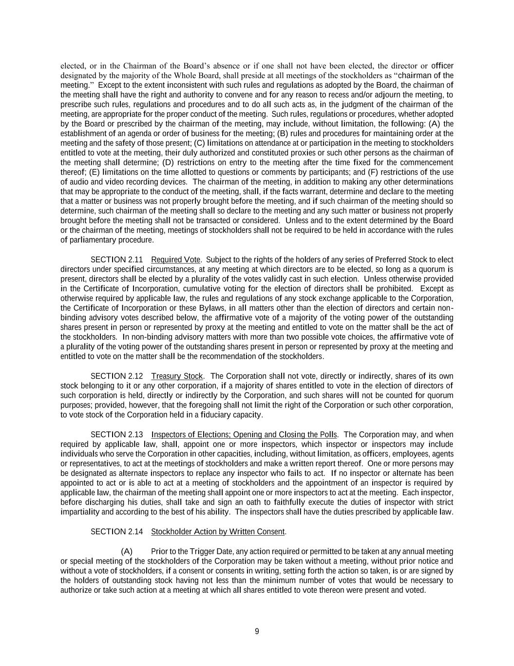 9 elected, or in the Chairman of the Board’s absence or if one shall not have been elected, the director or officer designated by the majority of the Whole Board, shall preside at all meetings of the stockholders as “chairman of the meeting.” Except to the extent inconsistent with such rules and regulations as adopted by the Board, the chairman of the meeting shall have the right and authority to convene and for any reason to recess and/or adjourn the meeting, to prescribe such rules, regulations and procedures and to do all such acts as, in the judgment of the chairman of the meeting, are appropriate for the proper conduct of the meeting. Such rules, regulations or procedures, whether adopted by the Board or prescribed by the chairman of the meeting, may include, without limitation, the following: (A) the establishment of an agenda or order of business for the meeting; (B) rules and procedures for maintaining order at the meeting and the safety of those present; (C) limitations on attendance at or participation in the meeting to stockholders entitled to vote at the meeting, their duly authorized and constituted proxies or such other persons as the chairman of the meeting shall determine; (D) restrictions on entry to the meeting after the time fixed for the commencement thereof; (E) limitations on the time allotted to questions or comments by participants; and (F) restrictions of the use of audio and video recording devices. The chairman of the meeting, in addition to making any other determinations that may be appropriate to the conduct of the meeting, shall, if the facts warrant, determine and declare to the meeting that a matter or business was not properly brought before the meeting, and if such chairman of the meeting should so determine, such chairman of the meeting shall so declare to the meeting and any such matter or business not properly brought before the meeting shall not be transacted or considered. Unless and to the extent determined by the Board or the chairman of the meeting, meetings of stockholders shall not be required to be held in accordance with the rules of parliamentary procedure. SECTION 2.11 Required Vote. Subject to the rights of the holders of any series of Preferred Stock to elect directors under specified circumstances, at any meeting at which directors are to be elected, so long as a quorum is present, directors shall be elected by a plurality of the votes validly cast in such election. Unless otherwise provided in the Certificate of Incorporation, cumulative voting for the election of directors shall be prohibited. Except as otherwise required by applicable law, the rules and regulations of any stock exchange applicable to the Corporation, the Certificate of Incorporation or these Bylaws, in all matters other than the election of directors and certain non- binding advisory votes described below, the affirmative vote of a majority of the voting power of the outstanding shares present in person or represented by proxy at the meeting and entitled to vote on the matter shall be the act of the stockholders. In non-binding advisory matters with more than two possible vote choices, the affirmative vote of a plurality of the voting power of the outstanding shares present in person or represented by proxy at the meeting and entitled to vote on the matter shall be the recommendation of the stockholders. SECTION 2.12 Treasury Stock. The Corporation shall not vote, directly or indirectly, shares of its own stock belonging to it or any other corporation, if a majority of shares entitled to vote in the election of directors of such corporation is held, directly or indirectly by the Corporation, and such shares will not be counted for quorum purposes; provided, however, that the foregoing shall not limit the right of the Corporation or such other corporation, to vote stock of the Corporation held in a fiduciary capacity. SECTION 2.13 Inspectors of Elections; Opening and Closing the Polls. The Corporation may, and when required by applicable law, shall, appoint one or more inspectors, which inspector or inspectors may include individuals who serve the Corporation in other capacities, including, without limitation, as officers, employees, agents or representatives, to act at the meetings of stockholders and make a written report thereof. One or more persons may be designated as alternate inspectors to replace any inspector who fails to act. If no inspector or alternate has been appointed to act or is able to act at a meeting of stockholders and the appointment of an inspector is required by applicable law, the chairman of the meeting shall appoint one or more inspectors to act at the meeting. Each inspector, before discharging his duties, shall take and sign an oath to faithfully execute the duties of inspector with strict impartiality and according to the best of his ability. The inspectors shall have the duties prescribed by applicable law. SECTION 2.14 Stockholder Action by Written Consent. (A) Prior to the Trigger Date, any action required or permitted to be taken at any annual meeting or special meeting of the stockholders of the Corporation may be taken without a meeting, without prior notice and without a vote of stockholders, if a consent or consents in writing, setting forth the action so taken, is or are signed by the holders of outstanding stock having not less than the minimum number of votes that would be necessary to authorize or take such action at a meeting at which all shares entitled to vote thereon were present and voted.