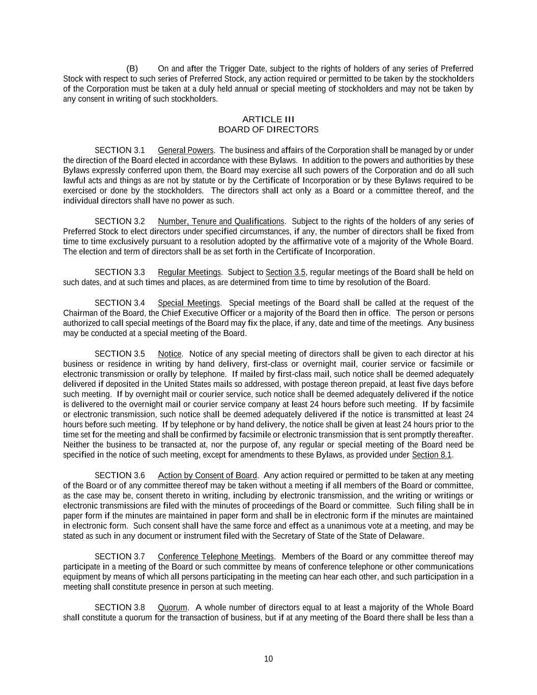10 (B) On and after the Trigger Date, subject to the rights of holders of any series of Preferred Stock with respect to such series of Preferred Stock, any action required or permitted to be taken by the stockholders of the Corporation must be taken at a duly held annual or special meeting of stockholders and may not be taken by any consent in writing of such stockholders. ARTICLE III BOARD OF DIRECTORS SECTION 3.1 General Powers. The business and affairs of the Corporation shall be managed by or under the direction of the Board elected in accordance with these Bylaws. In addition to the powers and authorities by these Bylaws expressly conferred upon them, the Board may exercise all such powers of the Corporation and do all such lawful acts and things as are not by statute or by the Certificate of Incorporation or by these Bylaws required to be exercised or done by the stockholders. The directors shall act only as a Board or a committee thereof, and the individual directors shall have no power as such. SECTION 3.2 Number, Tenure and Qualifications. Subject to the rights of the holders of any series of Preferred Stock to elect directors under specified circumstances, if any, the number of directors shall be fixed from time to time exclusively pursuant to a resolution adopted by the affirmative vote of a majority of the Whole Board. The election and term of directors shall be as set forth in the Certificate of Incorporation. SECTION 3.3 Regular Meetings. Subject to Section 3.5, regular meetings of the Board shall be held on such dates, and at such times and places, as are determined from time to time by resolution of the Board. SECTION 3.4 Special Meetings. Special meetings of the Board shall be called at the request of the Chairman of the Board, the Chief Executive Officer or a majority of the Board then in office. The person or persons authorized to call special meetings of the Board may fix the place, if any, date and time of the meetings. Any business may be conducted at a special meeting of the Board. SECTION 3.5 Notice. Notice of any special meeting of directors shall be given to each director at his business or residence in writing by hand delivery, first-class or overnight mail, courier service or facsimile or electronic transmission or orally by telephone. If mailed by first-class mail, such notice shall be deemed adequately delivered if deposited in the United States mails so addressed, with postage thereon prepaid, at least five days before such meeting. If by overnight mail or courier service, such notice shall be deemed adequately delivered if the notice is delivered to the overnight mail or courier service company at least 24 hours before such meeting. If by facsimile or electronic transmission, such notice shall be deemed adequately delivered if the notice is transmitted at least 24 hours before such meeting. If by telephone or by hand delivery, the notice shall be given at least 24 hours prior to the time set for the meeting and shall be confirmed by facsimile or electronic transmission that is sent promptly thereafter. Neither the business to be transacted at, nor the purpose of, any regular or special meeting of the Board need be specified in the notice of such meeting, except for amendments to these Bylaws, as provided under Section 8.1. SECTION 3.6 Action by Consent of Board. Any action required or permitted to be taken at any meeting of the Board or of any committee thereof may be taken without a meeting if all members of the Board or committee, as the case may be, consent thereto in writing, including by electronic transmission, and the writing or writings or electronic transmissions are filed with the minutes of proceedings of the Board or committee. Such filing shall be in paper form if the minutes are maintained in paper form and shall be in electronic form if the minutes are maintained in electronic form. Such consent shall have the same force and effect as a unanimous vote at a meeting, and may be stated as such in any document or instrument filed with the Secretary of State of the State of Delaware. SECTION 3.7 Conference Telephone Meetings. Members of the Board or any committee thereof may participate in a meeting of the Board or such committee by means of conference telephone or other communications equipment by means of which all persons participating in the meeting can hear each other, and such participation in a meeting shall constitute presence in person at such meeting. SECTION 3.8 Quorum. A whole number of directors equal to at least a majority of the Whole Board shall constitute a quorum for the transaction of business, but if at any meeting of the Board there shall be less than a