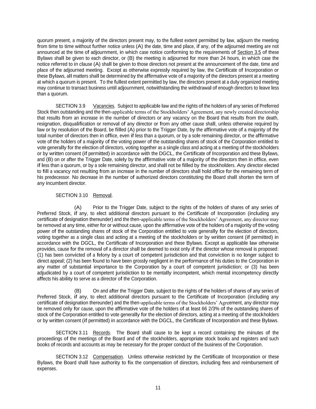 11 quorum present, a majority of the directors present may, to the fullest extent permitted by law, adjourn the meeting from time to time without further notice unless (A) the date, time and place, if any, of the adjourned meeting are not announced at the time of adjournment, in which case notice conforming to the requirements of Section 3.5 of these Bylaws shall be given to each director, or (B) the meeting is adjourned for more than 24 hours, in which case the notice referred to in clause (A) shall be given to those directors not present at the announcement of the date, time and place of the adjourned meeting. Except as otherwise expressly required by law, the Certificate of Incorporation or these Bylaws, all matters shall be determined by the affirmative vote of a majority of the directors present at a meeting at which a quorum is present. To the fullest extent permitted by law, the directors present at a duly organized meeting may continue to transact business until adjournment, notwithstanding the withdrawal of enough directors to leave less than a quorum. SECTION 3.9 Vacancies. Subject to applicable law and the rights of the holders of any series of Preferred Stock then outstanding and the then-applicable terms of the Stockholders’ Agreement, any newly created directorship that results from an increase in the number of directors or any vacancy on the Board that results from the death, resignation, disqualification or removal of any director or from any other cause shall, unless otherwise required by law or by resolution of the Board, be filled (A) prior to the Trigger Date, by the affirmative vote of a majority of the total number of directors then in office, even if less than a quorum, or by a sole remaining director, or the affirmative vote of the holders of a majority of the voting power of the outstanding shares of stock of the Corporation entitled to vote generally for the election of directors, voting together as a single class and acting at a meeting of the stockholders or by written consent (if permitted) in accordance with the DGCL, the Certificate of Incorporation and these Bylaws, and (B) on or after the Trigger Date, solely by the affirmative vote of a majority of the directors then in office, even if less than a quorum, or by a sole remaining director, and shall not be filled by the stockholders. Any director elected to fill a vacancy not resulting from an increase in the number of directors shall hold office for the remaining term of his predecessor. No decrease in the number of authorized directors constituting the Board shall shorten the term of any incumbent director. SECTION 3.10 Removal. (A) Prior to the Trigger Date, subject to the rights of the holders of shares of any series of Preferred Stock, if any, to elect additional directors pursuant to the Certificate of Incorporation (including any certificate of designation thereunder) and the then-applicable terms of the Stockholders’ Agreement, any director may be removed at any time, either for or without cause, upon the affirmative vote of the holders of a majority of the voting power of the outstanding shares of stock of the Corporation entitled to vote generally for the election of directors, voting together as a single class and acting at a meeting of the stockholders or by written consent (if permitted) in accordance with the DGCL, the Certificate of Incorporation and these Bylaws. Except as applicable law otherwise provides, cause for the removal of a director shall be deemed to exist only if the director whose removal is proposed: (1) has been convicted of a felony by a court of competent jurisdiction and that conviction is no longer subject to direct appeal; (2) has been found to have been grossly negligent in the performance of his duties to the Corporation in any matter of substantial importance to the Corporation by a court of competent jurisdiction; or (3) has been adjudicated by a court of competent jurisdiction to be mentally incompetent, which mental incompetency directly affects his ability to serve as a director of the Corporation. (B) On and after the Trigger Date, subject to the rights of the holders of shares of any series of Preferred Stock, if any, to elect additional directors pursuant to the Certificate of Incorporation (including any certificate of designation thereunder) and the then-applicable terms of the Stockholders’ Agreement, any director may be removed only for cause, upon the affirmative vote of the holders of at least 66 2/3% of the outstanding shares of stock of the Corporation entitled to vote generally for the election of directors, acting at a meeting of the stockholders or by written consent (if permitted) in accordance with the DGCL, the Certificate of Incorporation and these Bylaws. SECTION 3.11 Records. The Board shall cause to be kept a record containing the minutes of the proceedings of the meetings of the Board and of the stockholders, appropriate stock books and registers and such books of records and accounts as may be necessary for the proper conduct of the business of the Corporation. SECTION 3.12 Compensation. Unless otherwise restricted by the Certificate of Incorporation or these Bylaws, the Board shall have authority to fix the compensation of directors, including fees and reimbursement of expenses.