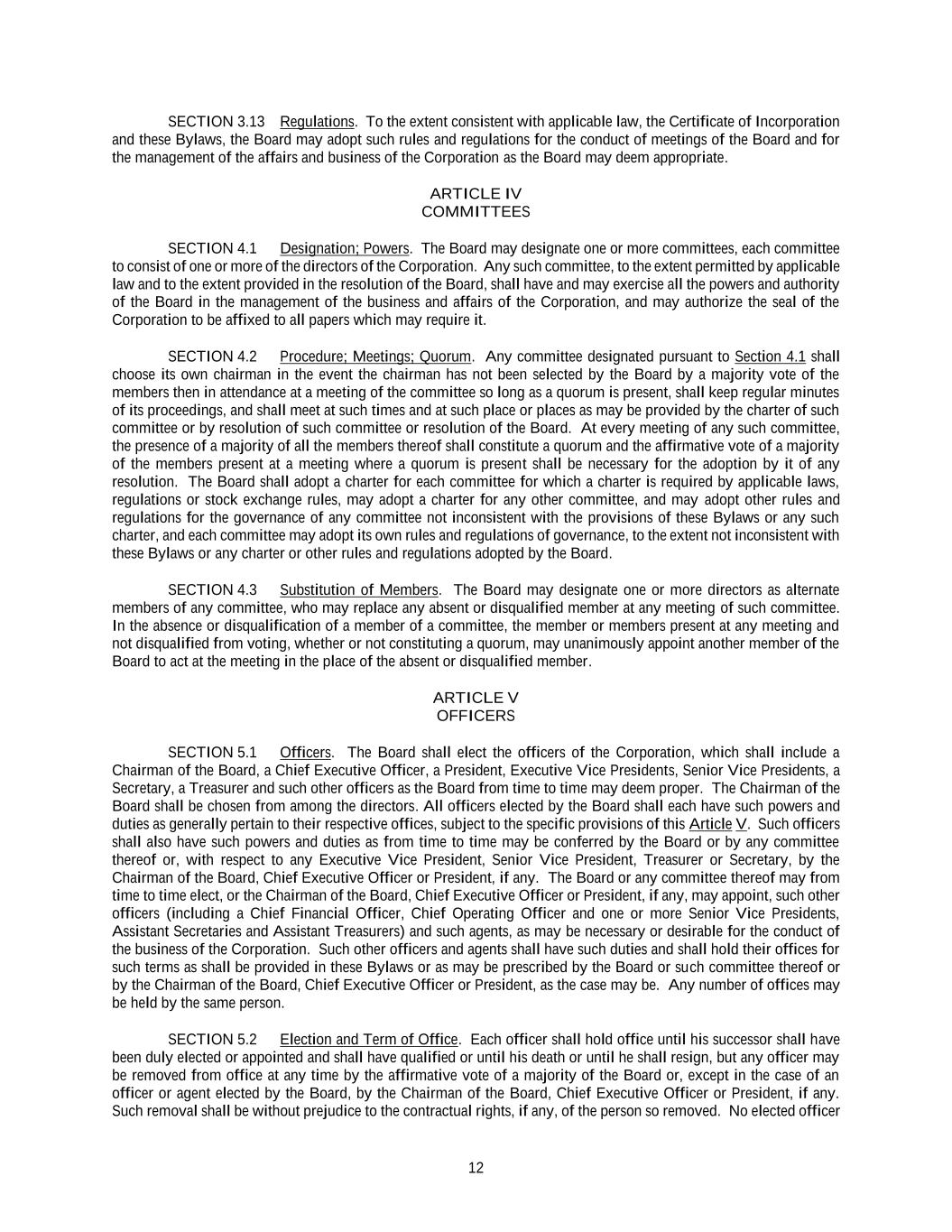 12 SECTION 3.13 Regulations. To the extent consistent with applicable law, the Certificate of Incorporation and these Bylaws, the Board may adopt such rules and regulations for the conduct of meetings of the Board and for the management of the affairs and business of the Corporation as the Board may deem appropriate. ARTICLE IV COMMITTEES SECTION 4.1 Designation; Powers. The Board may designate one or more committees, each committee to consist of one or more of the directors of the Corporation. Any such committee, to the extent permitted by applicable law and to the extent provided in the resolution of the Board, shall have and may exercise all the powers and authority of the Board in the management of the business and affairs of the Corporation, and may authorize the seal of the Corporation to be affixed to all papers which may require it. SECTION 4.2 Procedure; Meetings; Quorum. Any committee designated pursuant to Section 4.1 shall choose its own chairman in the event the chairman has not been selected by the Board by a majority vote of the members then in attendance at a meeting of the committee so long as a quorum is present, shall keep regular minutes of its proceedings, and shall meet at such times and at such place or places as may be provided by the charter of such committee or by resolution of such committee or resolution of the Board. At every meeting of any such committee, the presence of a majority of all the members thereof shall constitute a quorum and the affirmative vote of a majority of the members present at a meeting where a quorum is present shall be necessary for the adoption by it of any resolution. The Board shall adopt a charter for each committee for which a charter is required by applicable laws, regulations or stock exchange rules, may adopt a charter for any other committee, and may adopt other rules and regulations for the governance of any committee not inconsistent with the provisions of these Bylaws or any such charter, and each committee may adopt its own rules and regulations of governance, to the extent not inconsistent with these Bylaws or any charter or other rules and regulations adopted by the Board. SECTION 4.3 Substitution of Members. The Board may designate one or more directors as alternate members of any committee, who may replace any absent or disqualified member at any meeting of such committee. In the absence or disqualification of a member of a committee, the member or members present at any meeting and not disqualified from voting, whether or not constituting a quorum, may unanimously appoint another member of the Board to act at the meeting in the place of the absent or disqualified member. ARTICLE V OFFICERS SECTION 5.1 Officers. The Board shall elect the officers of the Corporation, which shall include a Chairman of the Board, a Chief Executive Officer, a President, Executive Vice Presidents, Senior Vice Presidents, a Secretary, a Treasurer and such other officers as the Board from time to time may deem proper. The Chairman of the Board shall be chosen from among the directors. All officers elected by the Board shall each have such powers and duties as generally pertain to their respective offices, subject to the specific provisions of this Article V. Such officers shall also have such powers and duties as from time to time may be conferred by the Board or by any committee thereof or, with respect to any Executive Vice President, Senior Vice President, Treasurer or Secretary, by the Chairman of the Board, Chief Executive Officer or President, if any. The Board or any committee thereof may from time to time elect, or the Chairman of the Board, Chief Executive Officer or President, if any, may appoint, such other officers (including a Chief Financial Officer, Chief Operating Officer and one or more Senior Vice Presidents, Assistant Secretaries and Assistant Treasurers) and such agents, as may be necessary or desirable for the conduct of the business of the Corporation. Such other officers and agents shall have such duties and shall hold their offices for such terms as shall be provided in these Bylaws or as may be prescribed by the Board or such committee thereof or by the Chairman of the Board, Chief Executive Officer or President, as the case may be. Any number of offices may be held by the same person. SECTION 5.2 Election and Term of Office. Each officer shall hold office until his successor shall have been duly elected or appointed and shall have qualified or until his death or until he shall resign, but any officer may be removed from office at any time by the affirmative vote of a majority of the Board or, except in the case of an officer or agent elected by the Board, by the Chairman of the Board, Chief Executive Officer or President, if any. Such removal shall be without prejudice to the contractual rights, if any, of the person so removed. No elected officer