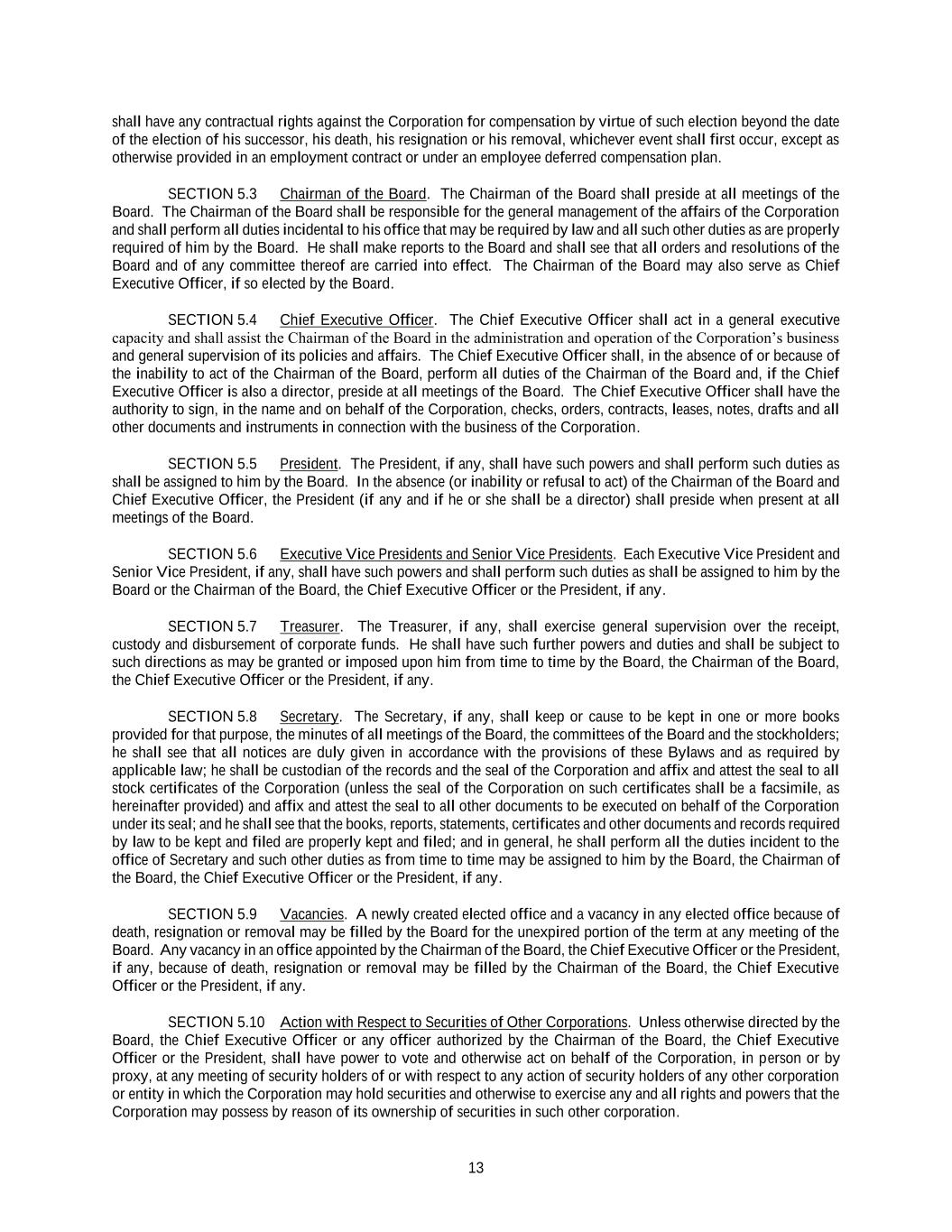 13 shall have any contractual rights against the Corporation for compensation by virtue of such election beyond the date of the election of his successor, his death, his resignation or his removal, whichever event shall first occur, except as otherwise provided in an employment contract or under an employee deferred compensation plan. SECTION 5.3 Chairman of the Board. The Chairman of the Board shall preside at all meetings of the Board. The Chairman of the Board shall be responsible for the general management of the affairs of the Corporation and shall perform all duties incidental to his office that may be required by law and all such other duties as are properly required of him by the Board. He shall make reports to the Board and shall see that all orders and resolutions of the Board and of any committee thereof are carried into effect. The Chairman of the Board may also serve as Chief Executive Officer, if so elected by the Board. SECTION 5.4 Chief Executive Officer. The Chief Executive Officer shall act in a general executive capacity and shall assist the Chairman of the Board in the administration and operation of the Corporation’s business and general supervision of its policies and affairs. The Chief Executive Officer shall, in the absence of or because of the inability to act of the Chairman of the Board, perform all duties of the Chairman of the Board and, if the Chief Executive Officer is also a director, preside at all meetings of the Board. The Chief Executive Officer shall have the authority to sign, in the name and on behalf of the Corporation, checks, orders, contracts, leases, notes, drafts and all other documents and instruments in connection with the business of the Corporation. SECTION 5.5 President. The President, if any, shall have such powers and shall perform such duties as shall be assigned to him by the Board. In the absence (or inability or refusal to act) of the Chairman of the Board and Chief Executive Officer, the President (if any and if he or she shall be a director) shall preside when present at all meetings of the Board. SECTION 5.6 Executive Vice Presidents and Senior Vice Presidents. Each Executive Vice President and Senior Vice President, if any, shall have such powers and shall perform such duties as shall be assigned to him by the Board or the Chairman of the Board, the Chief Executive Officer or the President, if any. SECTION 5.7 Treasurer. The Treasurer, if any, shall exercise general supervision over the receipt, custody and disbursement of corporate funds. He shall have such further powers and duties and shall be subject to such directions as may be granted or imposed upon him from time to time by the Board, the Chairman of the Board, the Chief Executive Officer or the President, if any. SECTION 5.8 Secretary. The Secretary, if any, shall keep or cause to be kept in one or more books provided for that purpose, the minutes of all meetings of the Board, the committees of the Board and the stockholders; he shall see that all notices are duly given in accordance with the provisions of these Bylaws and as required by applicable law; he shall be custodian of the records and the seal of the Corporation and affix and attest the seal to all stock certificates of the Corporation (unless the seal of the Corporation on such certificates shall be a facsimile, as hereinafter provided) and affix and attest the seal to all other documents to be executed on behalf of the Corporation under its seal; and he shall see that the books, reports, statements, certificates and other documents and records required by law to be kept and filed are properly kept and filed; and in general, he shall perform all the duties incident to the office of Secretary and such other duties as from time to time may be assigned to him by the Board, the Chairman of the Board, the Chief Executive Officer or the President, if any. SECTION 5.9 Vacancies. A newly created elected office and a vacancy in any elected office because of death, resignation or removal may be filled by the Board for the unexpired portion of the term at any meeting of the Board. Any vacancy in an office appointed by the Chairman of the Board, the Chief Executive Officer or the President, if any, because of death, resignation or removal may be filled by the Chairman of the Board, the Chief Executive Officer or the President, if any. SECTION 5.10 Action with Respect to Securities of Other Corporations. Unless otherwise directed by the Board, the Chief Executive Officer or any officer authorized by the Chairman of the Board, the Chief Executive Officer or the President, shall have power to vote and otherwise act on behalf of the Corporation, in person or by proxy, at any meeting of security holders of or with respect to any action of security holders of any other corporation or entity in which the Corporation may hold securities and otherwise to exercise any and all rights and powers that the Corporation may possess by reason of its ownership of securities in such other corporation.