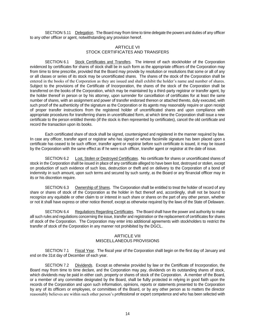 14 SECTION 5.11 Delegation. The Board may from time to time delegate the powers and duties of any officer to any other officer or agent, notwithstanding any provision hereof. ARTICLE VI STOCK CERTIFICATES AND TRANSFERS SECTION 6.1 Stock Certificates and Transfers. The interest of each stockholder of the Corporation evidenced by certificates for shares of stock shall be in such form as the appropriate officers of the Corporation may from time to time prescribe, provided that the Board may provide by resolution or resolutions that some or all of any or all classes or series of its stock may be uncertificated shares. The shares of the stock of the Corporation shall be entered in the books of the Corporation as they are issued and shall exhibit the holder’s name and number of shares. Subject to the provisions of the Certificate of Incorporation, the shares of the stock of the Corporation shall be transferred on the books of the Corporation, which may be maintained by a third-party registrar or transfer agent, by the holder thereof in person or by his attorney, upon surrender for cancellation of certificates for at least the same number of shares, with an assignment and power of transfer endorsed thereon or attached thereto, duly executed, with such proof of the authenticity of the signature as the Corporation or its agents may reasonably require or upon receipt of proper transfer instructions from the registered holder of uncertificated shares and upon compliance with appropriate procedures for transferring shares in uncertificated form, at which time the Corporation shall issue a new certificate to the person entitled thereto (if the stock is then represented by certificates), cancel the old certificate and record the transaction upon its books. Each certificated share of stock shall be signed, countersigned and registered in the manner required by law. In case any officer, transfer agent or registrar who has signed or whose facsimile signature has been placed upon a certificate has ceased to be such officer, transfer agent or registrar before such certificate is issued, it may be issued by the Corporation with the same effect as if he were such officer, transfer agent or registrar at the date of issue. SECTION 6.2 Lost, Stolen or Destroyed Certificates. No certificate for shares or uncertificated shares of stock in the Corporation shall be issued in place of any certificate alleged to have been lost, destroyed or stolen, except on production of such evidence of such loss, destruction or theft and on delivery to the Corporation of a bond of indemnity in such amount, upon such terms and secured by such surety, as the Board or any financial officer may in its or his discretion require. SECTION 6.3 Ownership of Shares. The Corporation shall be entitled to treat the holder of record of any share or shares of stock of the Corporation as the holder in fact thereof and, accordingly, shall not be bound to recognize any equitable or other claim to or interest in such share or shares on the part of any other person, whether or not it shall have express or other notice thereof, except as otherwise required by the laws of the State of Delaware. SECTION 6.4 Regulations Regarding Certificates. The Board shall have the power and authority to make all such rules and regulations concerning the issue, transfer and registration or the replacement of certificates for shares of stock of the Corporation. The Corporation may enter into additional agreements with stockholders to restrict the transfer of stock of the Corporation in any manner not prohibited by the DGCL. ARTICLE VII MISCELLANEOUS PROVISIONS SECTION 7.1 Fiscal Year. The fiscal year of the Corporation shall begin on the first day of January and end on the 31st day of December of each year. SECTION 7.2 Dividends. Except as otherwise provided by law or the Certificate of Incorporation, the Board may from time to time declare, and the Corporation may pay, dividends on its outstanding shares of stock, which dividends may be paid in either cash, property or shares of stock of the Corporation. A member of the Board, or a member of any committee designated by the Board, shall be fully protected in relying in good faith upon the records of the Corporation and upon such information, opinions, reports or statements presented to the Corporation by any of its officers or employees, or committees of the Board, or by any other person as to matters the director reasonably believes are within such other person’s professional or expert competence and who has been selected with