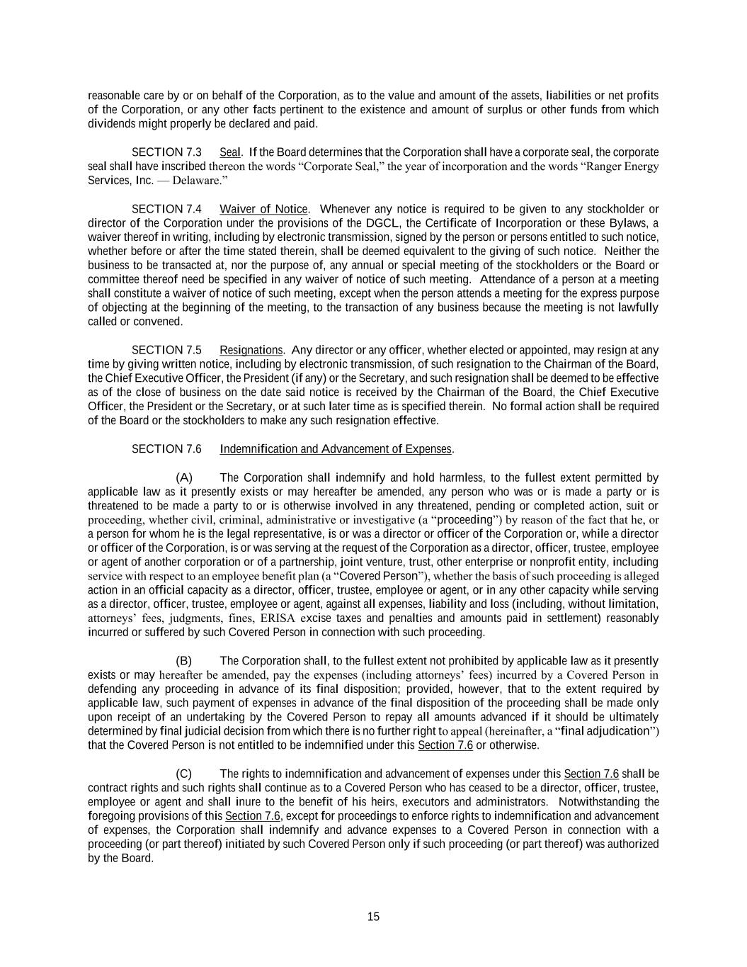 15 reasonable care by or on behalf of the Corporation, as to the value and amount of the assets, liabilities or net profits of the Corporation, or any other facts pertinent to the existence and amount of surplus or other funds from which dividends might properly be declared and paid. SECTION 7.3 Seal. If the Board determines that the Corporation shall have a corporate seal, the corporate seal shall have inscribed thereon the words “Corporate Seal,” the year of incorporation and the words “Ranger Energy Services, Inc. — Delaware.” SECTION 7.4 Waiver of Notice. Whenever any notice is required to be given to any stockholder or director of the Corporation under the provisions of the DGCL, the Certificate of Incorporation or these Bylaws, a waiver thereof in writing, including by electronic transmission, signed by the person or persons entitled to such notice, whether before or after the time stated therein, shall be deemed equivalent to the giving of such notice. Neither the business to be transacted at, nor the purpose of, any annual or special meeting of the stockholders or the Board or committee thereof need be specified in any waiver of notice of such meeting. Attendance of a person at a meeting shall constitute a waiver of notice of such meeting, except when the person attends a meeting for the express purpose of objecting at the beginning of the meeting, to the transaction of any business because the meeting is not lawfully called or convened. SECTION 7.5 Resignations. Any director or any officer, whether elected or appointed, may resign at any time by giving written notice, including by electronic transmission, of such resignation to the Chairman of the Board, the Chief Executive Officer, the President (if any) or the Secretary, and such resignation shall be deemed to be effective as of the close of business on the date said notice is received by the Chairman of the Board, the Chief Executive Officer, the President or the Secretary, or at such later time as is specified therein. No formal action shall be required of the Board or the stockholders to make any such resignation effective. SECTION 7.6 Indemnification and Advancement of Expenses. (A) The Corporation shall indemnify and hold harmless, to the fullest extent permitted by applicable law as it presently exists or may hereafter be amended, any person who was or is made a party or is threatened to be made a party to or is otherwise involved in any threatened, pending or completed action, suit or proceeding, whether civil, criminal, administrative or investigative (a “proceeding”) by reason of the fact that he, or a person for whom he is the legal representative, is or was a director or officer of the Corporation or, while a director or officer of the Corporation, is or was serving at the request of the Corporation as a director, officer, trustee, employee or agent of another corporation or of a partnership, joint venture, trust, other enterprise or nonprofit entity, including service with respect to an employee benefit plan (a “Covered Person”), whether the basis of such proceeding is alleged action in an official capacity as a director, officer, trustee, employee or agent, or in any other capacity while serving as a director, officer, trustee, employee or agent, against all expenses, liability and loss (including, without limitation, attorneys’ fees, judgments, fines, ERISA excise taxes and penalties and amounts paid in settlement) reasonably incurred or suffered by such Covered Person in connection with such proceeding. (B) The Corporation shall, to the fullest extent not prohibited by applicable law as it presently exists or may hereafter be amended, pay the expenses (including attorneys’ fees) incurred by a Covered Person in defending any proceeding in advance of its final disposition; provided, however, that to the extent required by applicable law, such payment of expenses in advance of the final disposition of the proceeding shall be made only upon receipt of an undertaking by the Covered Person to repay all amounts advanced if it should be ultimately determined by final judicial decision from which there is no further right to appeal (hereinafter, a “final adjudication”) that the Covered Person is not entitled to be indemnified under this Section 7.6 or otherwise. (C) The rights to indemnification and advancement of expenses under this Section 7.6 shall be contract rights and such rights shall continue as to a Covered Person who has ceased to be a director, officer, trustee, employee or agent and shall inure to the benefit of his heirs, executors and administrators. Notwithstanding the foregoing provisions of this Section 7.6, except for proceedings to enforce rights to indemnification and advancement of expenses, the Corporation shall indemnify and advance expenses to a Covered Person in connection with a proceeding (or part thereof) initiated by such Covered Person only if such proceeding (or part thereof) was authorized by the Board.