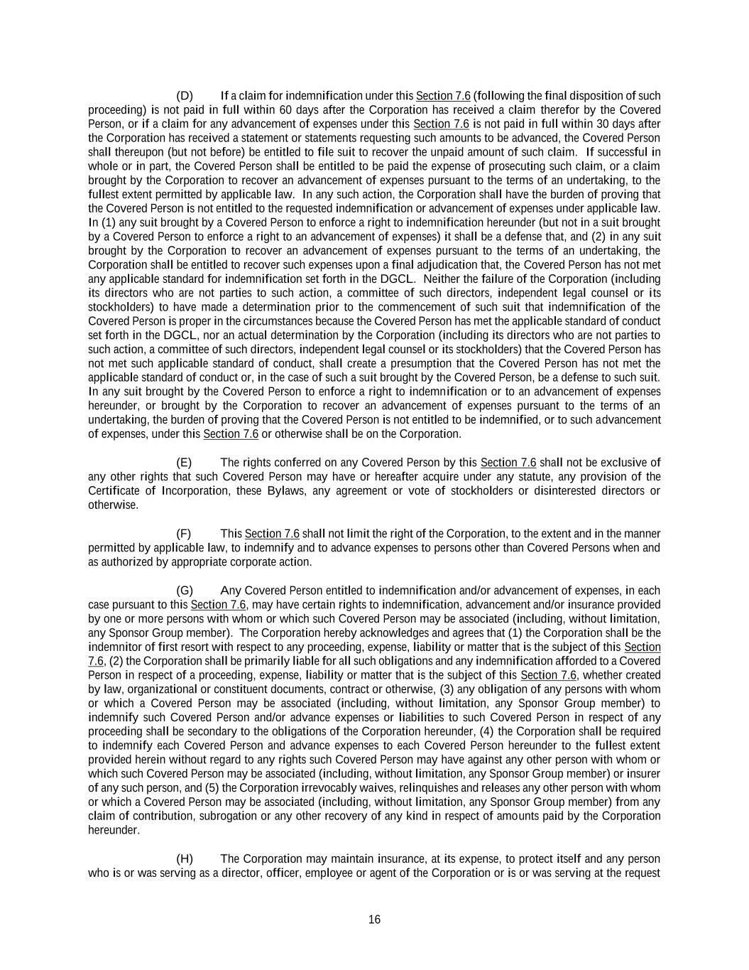 16 (D) If a claim for indemnification under this Section 7.6 (following the final disposition of such proceeding) is not paid in full within 60 days after the Corporation has received a claim therefor by the Covered Person, or if a claim for any advancement of expenses under this Section 7.6 is not paid in full within 30 days after the Corporation has received a statement or statements requesting such amounts to be advanced, the Covered Person shall thereupon (but not before) be entitled to file suit to recover the unpaid amount of such claim. If successful in whole or in part, the Covered Person shall be entitled to be paid the expense of prosecuting such claim, or a claim brought by the Corporation to recover an advancement of expenses pursuant to the terms of an undertaking, to the fullest extent permitted by applicable law. In any such action, the Corporation shall have the burden of proving that the Covered Person is not entitled to the requested indemnification or advancement of expenses under applicable law. In (1) any suit brought by a Covered Person to enforce a right to indemnification hereunder (but not in a suit brought by a Covered Person to enforce a right to an advancement of expenses) it shall be a defense that, and (2) in any suit brought by the Corporation to recover an advancement of expenses pursuant to the terms of an undertaking, the Corporation shall be entitled to recover such expenses upon a final adjudication that, the Covered Person has not met any applicable standard for indemnification set forth in the DGCL. Neither the failure of the Corporation (including its directors who are not parties to such action, a committee of such directors, independent legal counsel or its stockholders) to have made a determination prior to the commencement of such suit that indemnification of the Covered Person is proper in the circumstances because the Covered Person has met the applicable standard of conduct set forth in the DGCL, nor an actual determination by the Corporation (including its directors who are not parties to such action, a committee of such directors, independent legal counsel or its stockholders) that the Covered Person has not met such applicable standard of conduct, shall create a presumption that the Covered Person has not met the applicable standard of conduct or, in the case of such a suit brought by the Covered Person, be a defense to such suit. In any suit brought by the Covered Person to enforce a right to indemnification or to an advancement of expenses hereunder, or brought by the Corporation to recover an advancement of expenses pursuant to the terms of an undertaking, the burden of proving that the Covered Person is not entitled to be indemnified, or to such advancement of expenses, under this Section 7.6 or otherwise shall be on the Corporation. (E) The rights conferred on any Covered Person by this Section 7.6 shall not be exclusive of any other rights that such Covered Person may have or hereafter acquire under any statute, any provision of the Certificate of Incorporation, these Bylaws, any agreement or vote of stockholders or disinterested directors or otherwise. (F) This Section 7.6 shall not limit the right of the Corporation, to the extent and in the manner permitted by applicable law, to indemnify and to advance expenses to persons other than Covered Persons when and as authorized by appropriate corporate action. (G) Any Covered Person entitled to indemnification and/or advancement of expenses, in each case pursuant to this Section 7.6, may have certain rights to indemnification, advancement and/or insurance provided by one or more persons with whom or which such Covered Person may be associated (including, without limitation, any Sponsor Group member). The Corporation hereby acknowledges and agrees that (1) the Corporation shall be the indemnitor of first resort with respect to any proceeding, expense, liability or matter that is the subject of this Section 7.6, (2) the Corporation shall be primarily liable for all such obligations and any indemnification afforded to a Covered Person in respect of a proceeding, expense, liability or matter that is the subject of this Section 7.6, whether created by law, organizational or constituent documents, contract or otherwise, (3) any obligation of any persons with whom or which a Covered Person may be associated (including, without limitation, any Sponsor Group member) to indemnify such Covered Person and/or advance expenses or liabilities to such Covered Person in respect of any proceeding shall be secondary to the obligations of the Corporation hereunder, (4) the Corporation shall be required to indemnify each Covered Person and advance expenses to each Covered Person hereunder to the fullest extent provided herein without regard to any rights such Covered Person may have against any other person with whom or which such Covered Person may be associated (including, without limitation, any Sponsor Group member) or insurer of any such person, and (5) the Corporation irrevocably waives, relinquishes and releases any other person with whom or which a Covered Person may be associated (including, without limitation, any Sponsor Group member) from any claim of contribution, subrogation or any other recovery of any kind in respect of amounts paid by the Corporation hereunder. (H) The Corporation may maintain insurance, at its expense, to protect itself and any person who is or was serving as a director, officer, employee or agent of the Corporation or is or was serving at the request