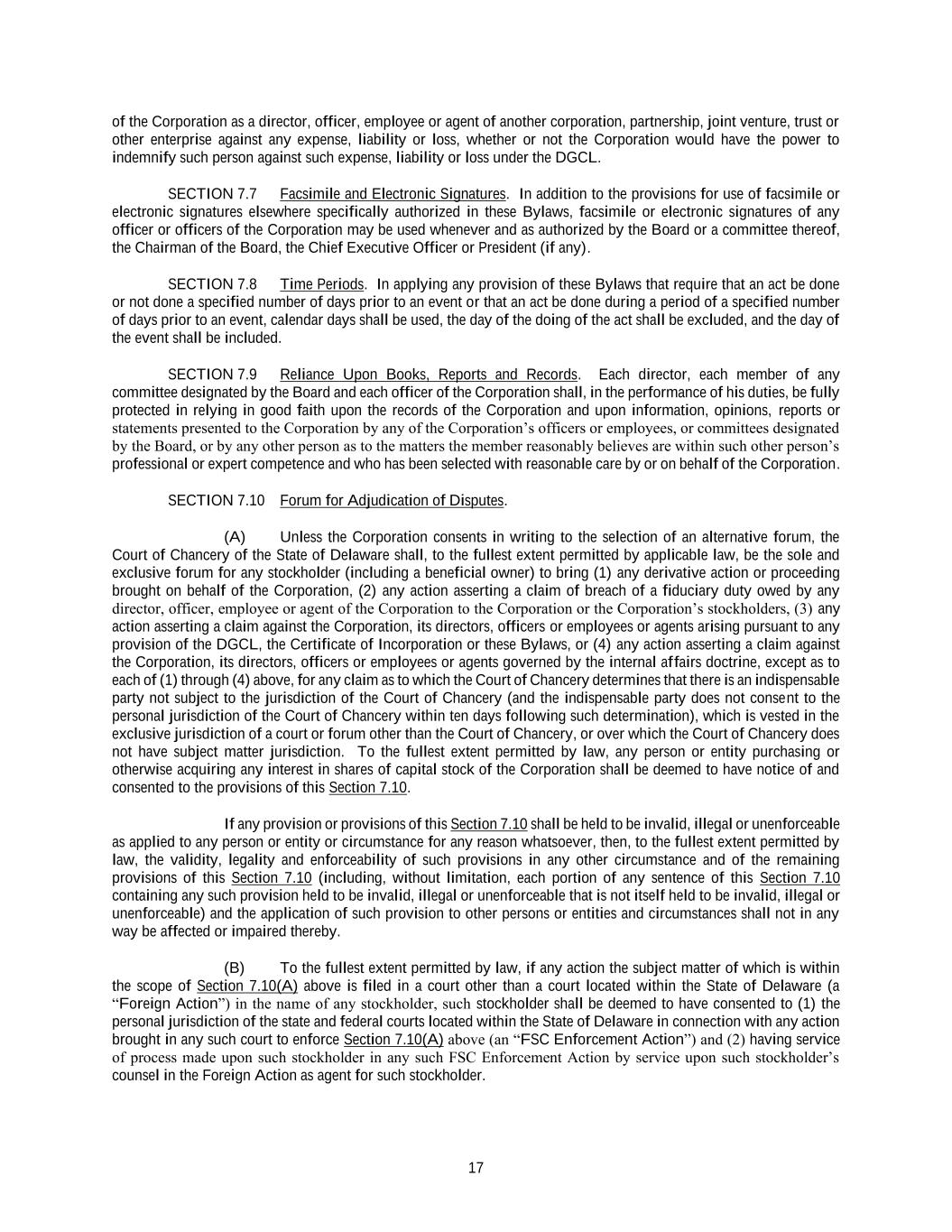 17 of the Corporation as a director, officer, employee or agent of another corporation, partnership, joint venture, trust or other enterprise against any expense, liability or loss, whether or not the Corporation would have the power to indemnify such person against such expense, liability or loss under the DGCL. SECTION 7.7 Facsimile and Electronic Signatures. In addition to the provisions for use of facsimile or electronic signatures elsewhere specifically authorized in these Bylaws, facsimile or electronic signatures of any officer or officers of the Corporation may be used whenever and as authorized by the Board or a committee thereof, the Chairman of the Board, the Chief Executive Officer or President (if any). SECTION 7.8 Time Periods. In applying any provision of these Bylaws that require that an act be done or not done a specified number of days prior to an event or that an act be done during a period of a specified number of days prior to an event, calendar days shall be used, the day of the doing of the act shall be excluded, and the day of the event shall be included. SECTION 7.9 Reliance Upon Books, Reports and Records. Each director, each member of any committee designated by the Board and each officer of the Corporation shall, in the performance of his duties, be fully protected in relying in good faith upon the records of the Corporation and upon information, opinions, reports or statements presented to the Corporation by any of the Corporation’s officers or employees, or committees designated by the Board, or by any other person as to the matters the member reasonably believes are within such other person’s professional or expert competence and who has been selected with reasonable care by or on behalf of the Corporation. SECTION 7.10 Forum for Adjudication of Disputes. (A) Unless the Corporation consents in writing to the selection of an alternative forum, the Court of Chancery of the State of Delaware shall, to the fullest extent permitted by applicable law, be the sole and exclusive forum for any stockholder (including a beneficial owner) to bring (1) any derivative action or proceeding brought on behalf of the Corporation, (2) any action asserting a claim of breach of a fiduciary duty owed by any director, officer, employee or agent of the Corporation to the Corporation or the Corporation’s stockholders, (3) any action asserting a claim against the Corporation, its directors, officers or employees or agents arising pursuant to any provision of the DGCL, the Certificate of Incorporation or these Bylaws, or (4) any action asserting a claim against the Corporation, its directors, officers or employees or agents governed by the internal affairs doctrine, except as to each of (1) through (4) above, for any claim as to which the Court of Chancery determines that there is an indispensable party not subject to the jurisdiction of the Court of Chancery (and the indispensable party does not consent to the personal jurisdiction of the Court of Chancery within ten days following such determination), which is vested in the exclusive jurisdiction of a court or forum other than the Court of Chancery, or over which the Court of Chancery does not have subject matter jurisdiction. To the fullest extent permitted by law, any person or entity purchasing or otherwise acquiring any interest in shares of capital stock of the Corporation shall be deemed to have notice of and consented to the provisions of this Section 7.10. If any provision or provisions of this Section 7.10 shall be held to be invalid, illegal or unenforceable as applied to any person or entity or circumstance for any reason whatsoever, then, to the fullest extent permitted by law, the validity, legality and enforceability of such provisions in any other circumstance and of the remaining provisions of this Section 7.10 (including, without limitation, each portion of any sentence of this Section 7.10 containing any such provision held to be invalid, illegal or unenforceable that is not itself held to be invalid, illegal or unenforceable) and the application of such provision to other persons or entities and circumstances shall not in any way be affected or impaired thereby. (B) To the fullest extent permitted by law, if any action the subject matter of which is within the scope of Section 7.10(A) above is filed in a court other than a court located within the State of Delaware (a “Foreign Action”) in the name of any stockholder, such stockholder shall be deemed to have consented to (1) the personal jurisdiction of the state and federal courts located within the State of Delaware in connection with any action brought in any such court to enforce Section 7.10(A) above (an “FSC Enforcement Action”) and (2) having service of process made upon such stockholder in any such FSC Enforcement Action by service upon such stockholder’s counsel in the Foreign Action as agent for such stockholder.