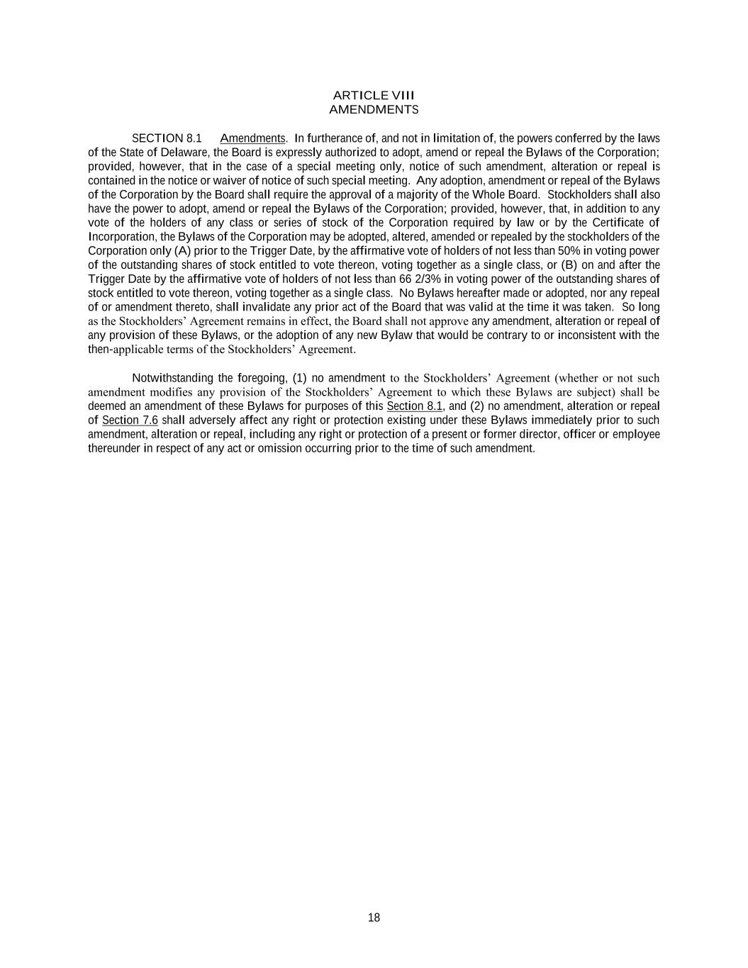 18 ARTICLE VIII AMENDMENTS SECTION 8.1 Amendments. In furtherance of, and not in limitation of, the powers conferred by the laws of the State of Delaware, the Board is expressly authorized to adopt, amend or repeal the Bylaws of the Corporation; provided, however, that in the case of a special meeting only, notice of such amendment, alteration or repeal is contained in the notice or waiver of notice of such special meeting. Any adoption, amendment or repeal of the Bylaws of the Corporation by the Board shall require the approval of a majority of the Whole Board. Stockholders shall also have the power to adopt, amend or repeal the Bylaws of the Corporation; provided, however, that, in addition to any vote of the holders of any class or series of stock of the Corporation required by law or by the Certificate of Incorporation, the Bylaws of the Corporation may be adopted, altered, amended or repealed by the stockholders of the Corporation only (A) prior to the Trigger Date, by the affirmative vote of holders of not less than 50% in voting power of the outstanding shares of stock entitled to vote thereon, voting together as a single class, or (B) on and after the Trigger Date by the affirmative vote of holders of not less than 66 2/3% in voting power of the outstanding shares of stock entitled to vote thereon, voting together as a single class. No Bylaws hereafter made or adopted, nor any repeal of or amendment thereto, shall invalidate any prior act of the Board that was valid at the time it was taken. So long as the Stockholders’ Agreement remains in effect, the Board shall not approve any amendment, alteration or repeal of any provision of these Bylaws, or the adoption of any new Bylaw that would be contrary to or inconsistent with the then-applicable terms of the Stockholders’ Agreement. Notwithstanding the foregoing, (1) no amendment to the Stockholders’ Agreement (whether or not such amendment modifies any provision of the Stockholders’ Agreement to which these Bylaws are subject) shall be deemed an amendment of these Bylaws for purposes of this Section 8.1, and (2) no amendment, alteration or repeal of Section 7.6 shall adversely affect any right or protection existing under these Bylaws immediately prior to such amendment, alteration or repeal, including any right or protection of a present or former director, officer or employee thereunder in respect of any act or omission occurring prior to the time of such amendment.