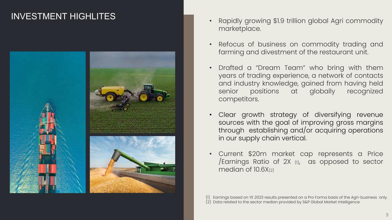 3 • Rapidly growing $1.9 trillion global Agri commodity marketplace. • Refocus of business on commodity trading and farming and divestment of the restaurant unit. • Drafted a “Dream Team” who bring with them years of trading experience, a network of contacts and industry knowledge, gained from having held senior positions at globally recognized competitors. • Clear growth strategy of diversifying revenue sources with the goal of improving gross margins through establishing and/or acquiring operations in our supply chain vertical. • Current $20m market cap represents a Price /Earnings Ratio of 2X (1), as opposed to sector median of 10.6X(2) INVESTMENT HIGHLITES 3 (1) Earnings based on YE 2023 results presented on a Pro Forma basis of the Agri-business only. (2) Data related to the sector median provided by S&P Global Market Intelligence