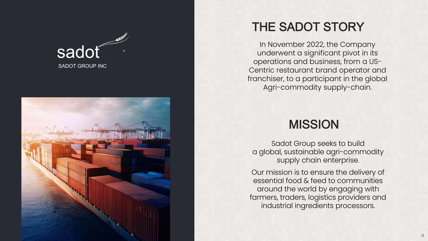 THE SADOT STORY sadot SADOT GROUP INC 4 In November 2022, the Company underwent a significant pivot in its operations and business, from a US- Centric restaurant brand operator and franchiser, to a participant in the global Agri-commodity supply-chain. MISSION Sadot Group seeks to build a global, sustainable agri-commodity supply chain enterprise. Our mission is to ensure the delivery of essential food & feed to communities around the world by engaging with farmers, traders, logistics providers and industrial ingredients processors.
