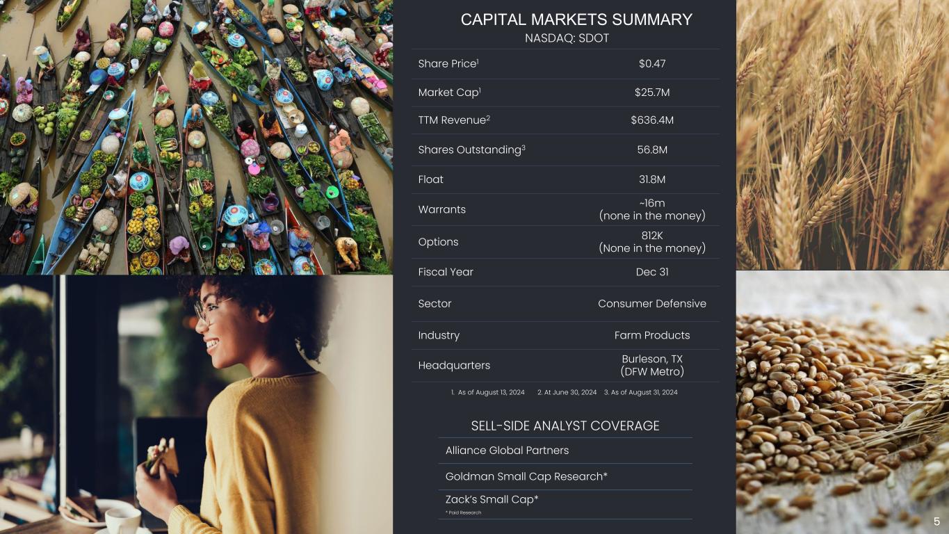 CAPITAL MARKETS SUMMARY NASDAQ: SDOT Share Price1 $0.47 Market Cap1 $25.7M TTM Revenue2 $636.4M Shares Outstanding3 56.8M Float 31.8M Warrants ~16m (none in the money) Options 812K (None in the money) Fiscal Year Dec 31 Sector Consumer Defensive Industry Farm Products Headquarters Burleson, TX (DFW Metro) 1. As of August 13, 2024 2. At June 30, 2024 3. As of August 31, 2024 5 SELL-SIDE ANALYST COVERAGE Alliance Global Partners Goldman Small Cap Research* Zack’s Small Cap* * Paid Research