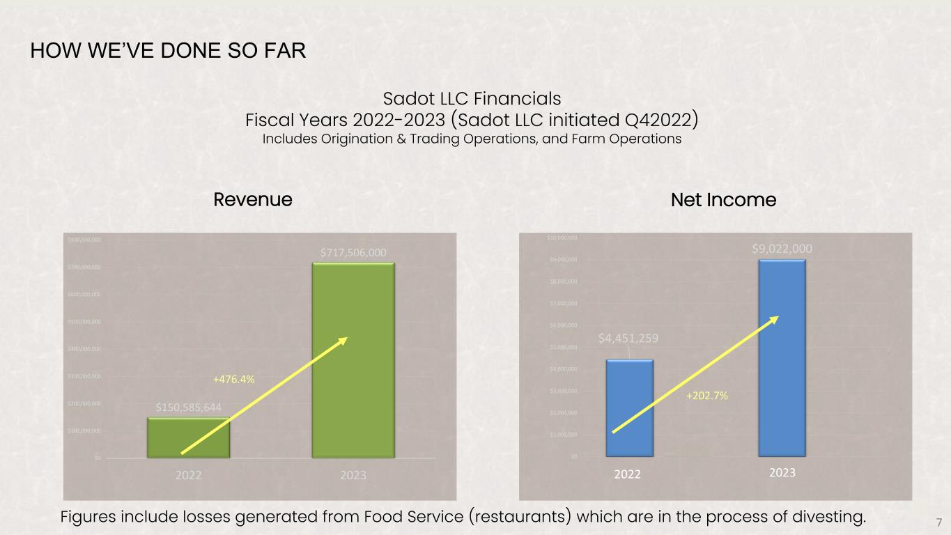 6 HOW WE’VE DONE SO FAR $10.4 $161.7 $726.7 $- $100 $200 $300 $400 $500 $600 $700 $800 2021 2022 2023 $(4.9) $(2.0) $0.1 $(6.0) $(5.0) $(4.0) $(3.0) $(2.0) $(1.0) $- $1.0 Revenue (Unaudited, $ in Millions) Adjusted EBITDA (Unaudited, $ in Millions) Company Wide Select Financials Fiscal Years 2021-2023 Includes Origination & Trading Operations, Farm Operations, And Food Services 6Figures include losses generated from Food Service (restaurants) which are in the process of divesting. +1558% +449.4% +245% +201% 2021 2022 2023