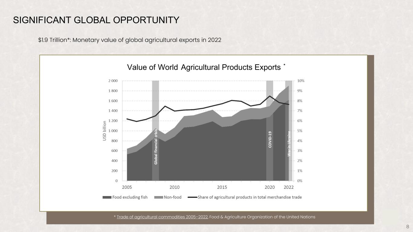 8 SIGNIFICANT GLOBAL OPPORTUNITY $1.9 Trillion*: Monetary value of global agricultural exports in 2022 Value of World Agricultural Products Exports * * Trade of agricultural commodities 2005–2022, Food & Agriculture Organization of the United Nations 8