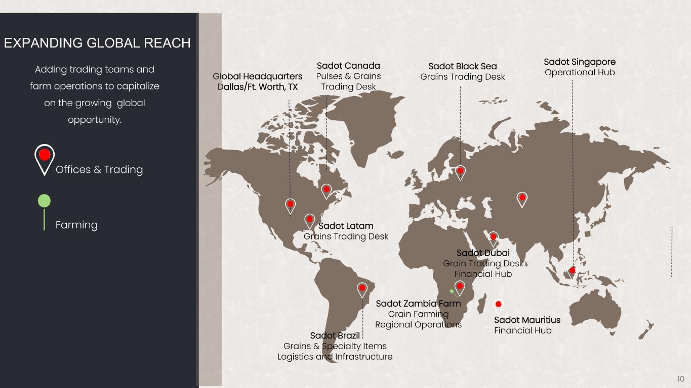 Feeding the world’s ever-growing population is a significant challenge. The United Nations projects that global population will grow from today’s 8.1 billion to 9.7 billion by 2050, with growth concentrated in developing countries. The growing middle-class populations in developing countries within Africa and Asia result in more calorie per capita consumption in general and specifically a growth in demand for animal proteins. Both of these factors increase the demand for agri-commodities as feed for animals. A growing part of the world’s population are in areas that have highly limited agricultural potential and require systems in place to provide a steady in-flow of food products. Urban expansion, global warming, and corrupted farmland contribute to a steady decrease in fertile agricultural land needed to grow grains and legumes (pulses) that are the building blocks of nutrition. POPULATION GROWTH GROWING DEMAND FOR ANIMAL FEED ARID GEOGRAPHIES DIMINISHING AGRICULTURE LAND 9 THE CASE FOR AGRI- COMMODITIES The demand for food and feed is projected to grow significantly through the end of the century. This demand will place stress on the global food supply chain. Sadot Group sees significant growth potential in providing sustainable solutions to address the world’s food security issues. GROWING GLOBAL MARKET
