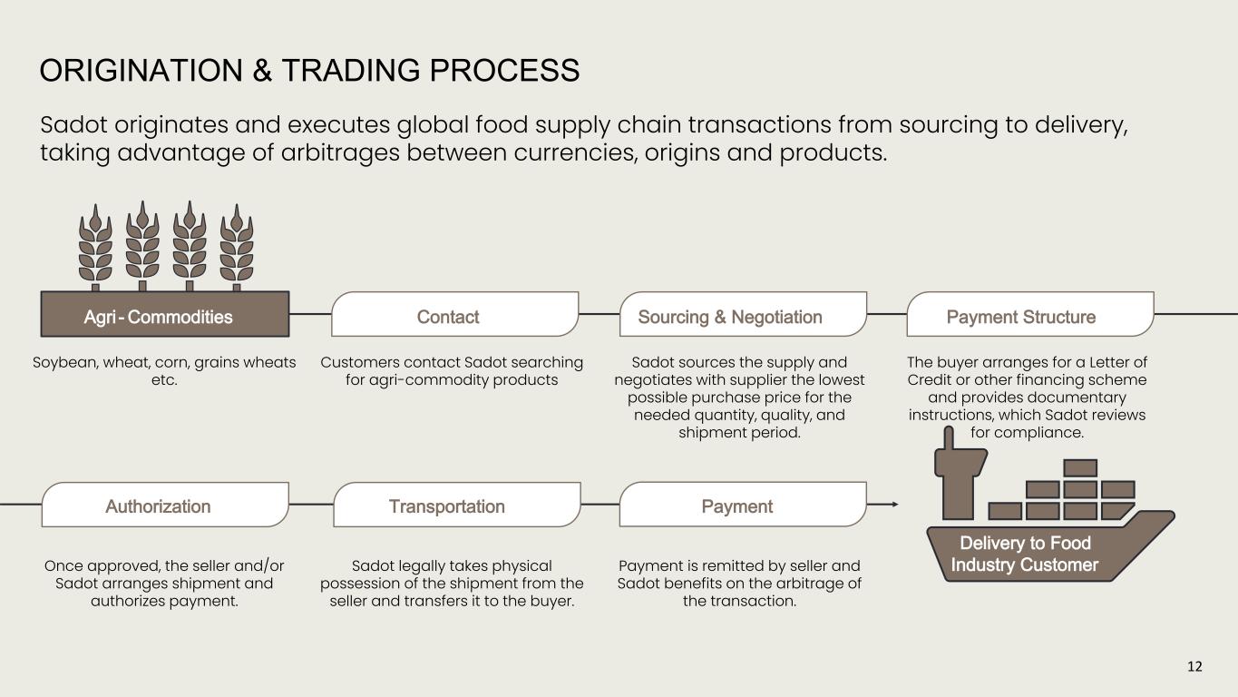 11 FARM OPERATIONS • Building out operations to provide leverage to trading operations ORIGINATION & TRADING OPERATIONS • Sourcing, buying and selling a wide variety of Agri-commodities worldwide. LEGACY FOOD SERVICE OPERATIONS – TO BE DIVESTED • Actively engaged in the review of potential sales opportunities for Pokémoto and Muscle Maker Grill. The Company announced the sale of Superfit Foods on August 1, 2024. 11 CORPORATE OVERVIEW Sadot Group Inc. is an emerging global agri-commodities supply chain organization with origination & trading operations located worldwide.