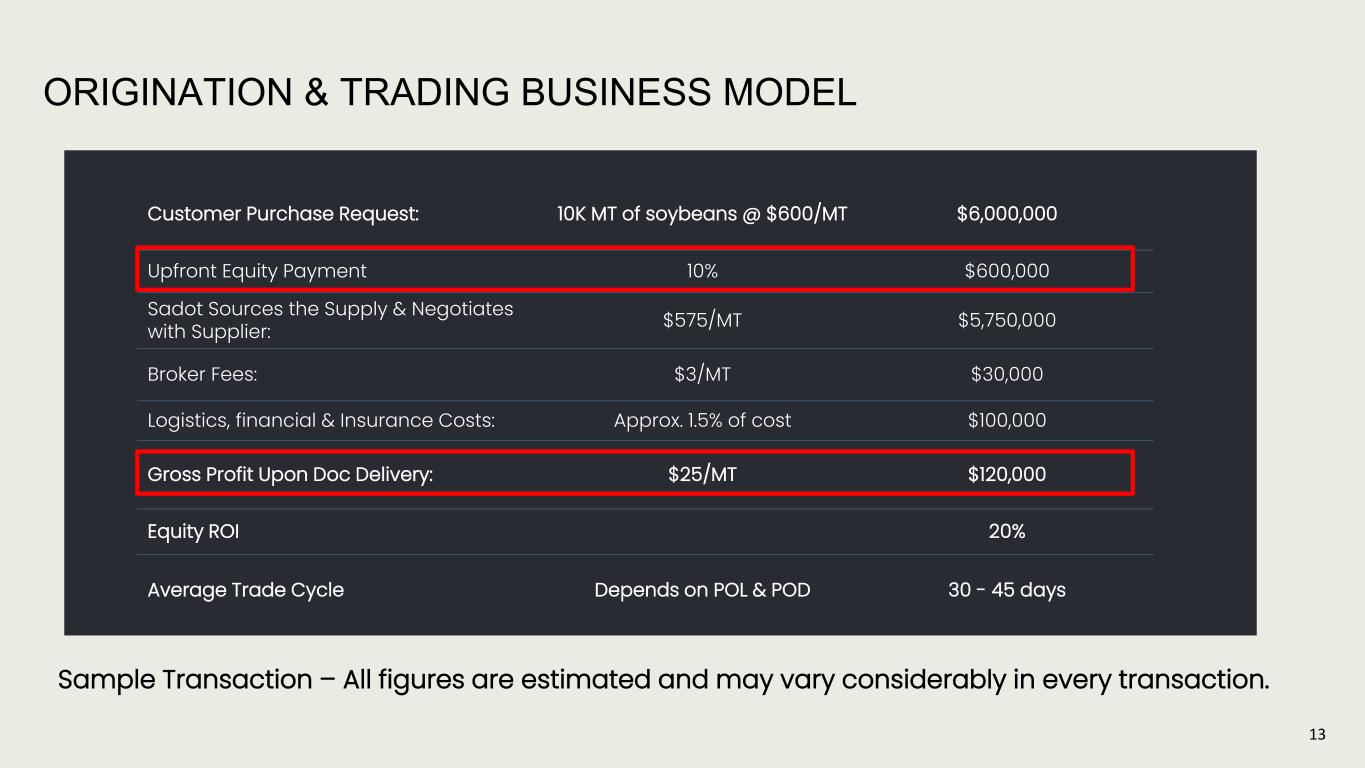 12 Authorization Transportation Payment Once approved, the seller and/or Sadot arranges shipment and authorizes payment. Sadot legally takes physical possession of the shipment from the seller and transfers it to the buyer. Payment is remitted by seller and Sadot benefits on the arbitrage of the transaction. ORIGINATION & TRADING PROCESS Sadot originates and executes global food supply chain transactions from sourcing to delivery, taking advantage of arbitrages between currencies, origins and products. Delivery to Food Industry Customer Agri - Commodities Contact Sourcing & Negotiation Payment Structure Soybean, wheat, corn, grains wheats etc. Customers contact Sadot searching for agri-commodity products Sadot sources the supply and negotiates with supplier the lowest possible purchase price for the needed quantity, quality, and shipment period. The buyer arranges for a Letter of Credit or other financing scheme and provides documentary instructions, which Sadot reviews for compliance.