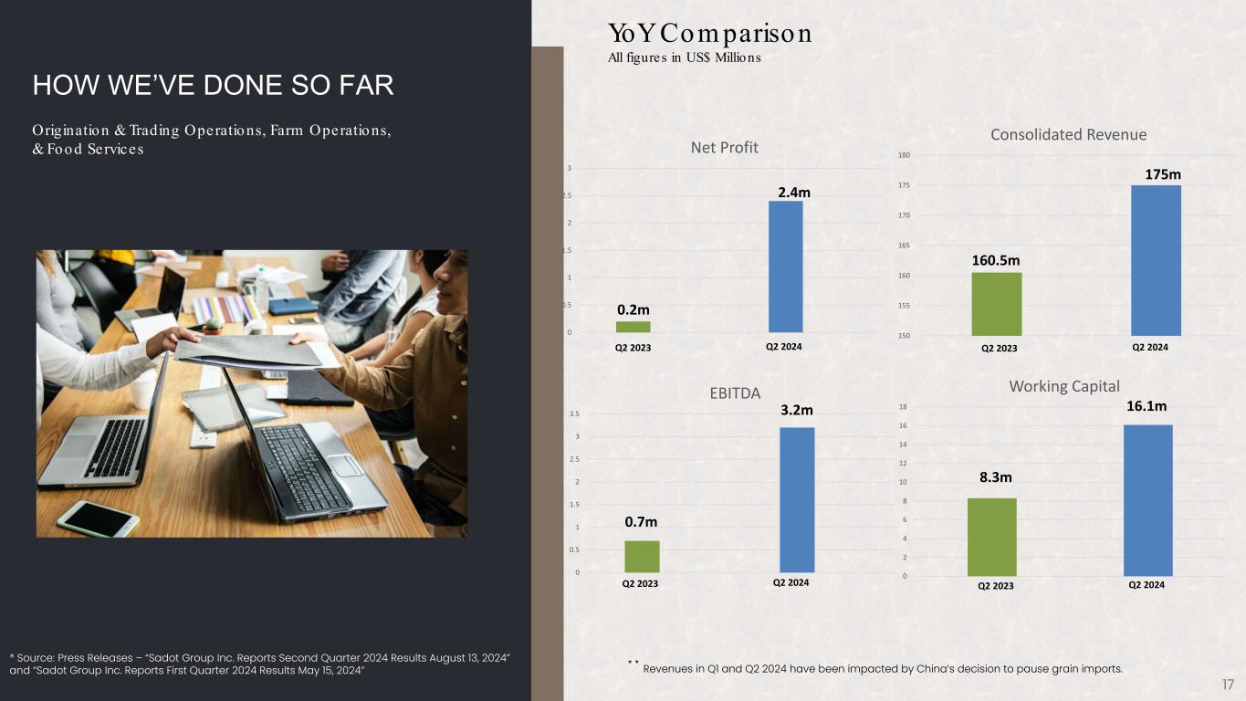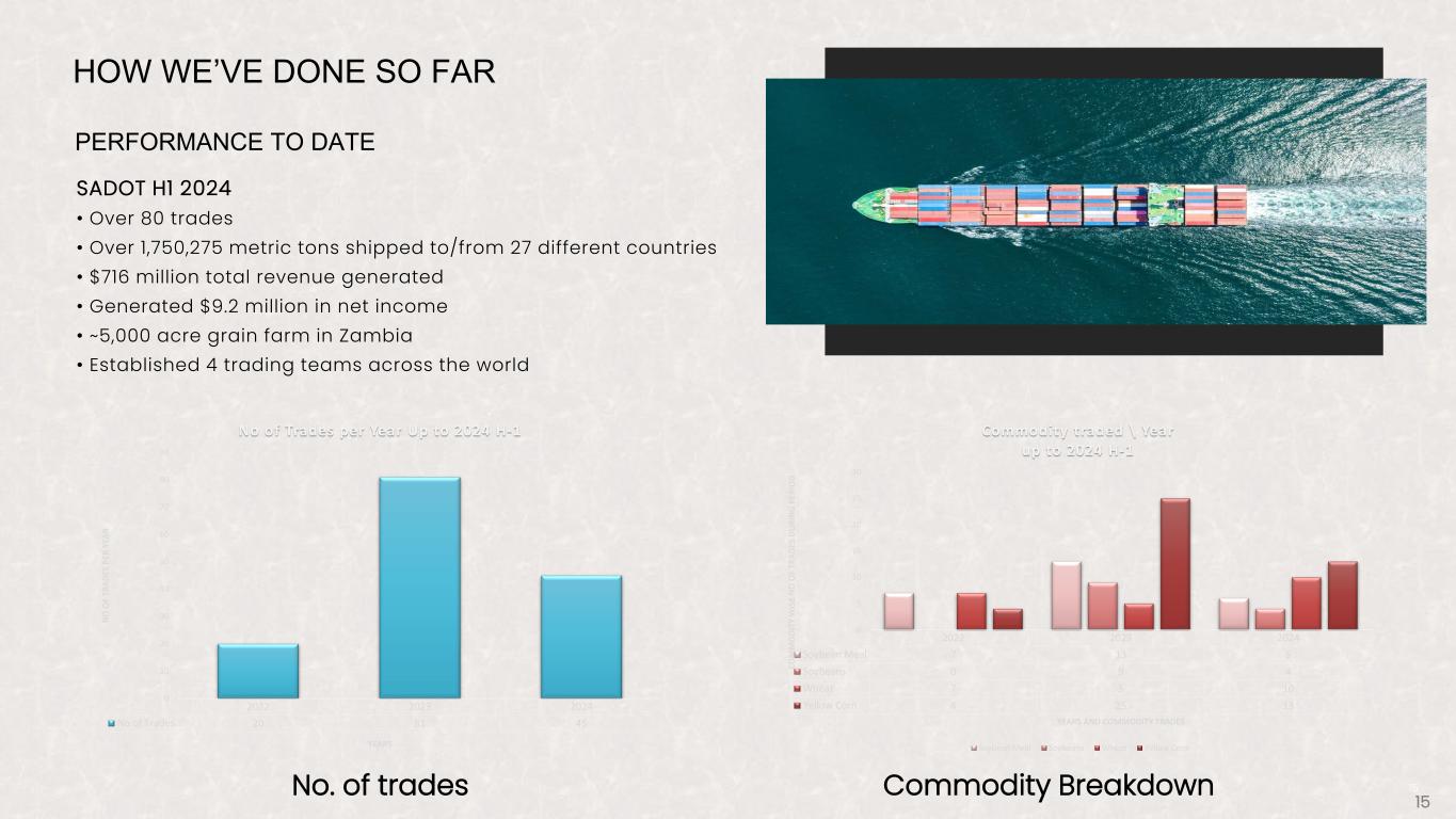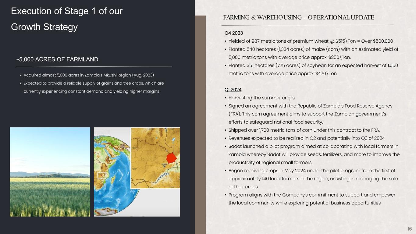 PERFORMANCE TO DATE SADOT H1 2024 • Over 80 trades • Over 1,750,275 metric tons shipped to/from 27 different countries • $716 million total revenue generated • Generated $9.2 million in net income • ~5,000 acre grain farm in Zambia • Established 4 trading teams across the world HOW WE’VE DONE SO FAR 15No. of trades 2022 2023 2024 No of Trades 20 81 45 0 10 20 30 40 50 60 70 80 90 N O O F TR AD ES P ER Y EA R YEARS No of Trades per Year Up to 2024 H-1 2022 2023 2024 Soybean Meal 7 13 6 Soybeans 0 9 4 Wheat 7 5 10 Yellow Corn 4 25 13 0 5 10 15 20 25 30 CO M M O DI TY W IS E N O O F TR AD ES D U RI N G P ER IO D YEARS AND COMMODITY TRADES Commodity traded \ Year up to 2024 H-1 Soybean Meal Soybeans Wheat Yellow Corn Commodity Breakdown 15