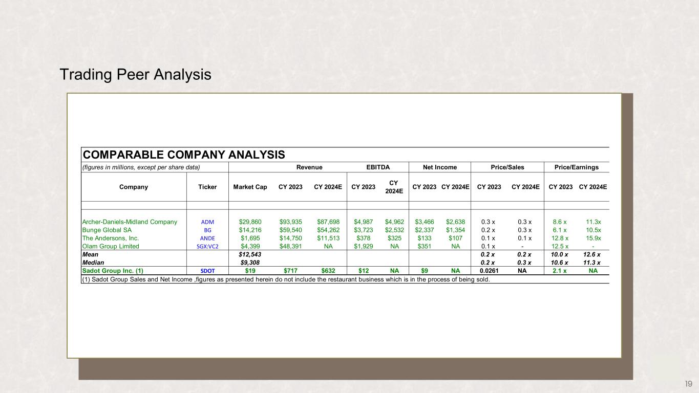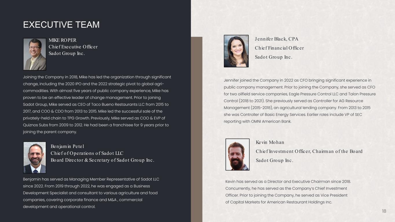 EXECUTIVE TEAM MIKE ROPER Chief Executive Officer Sadot Group Inc. Joining the Company in 2018, Mike has led the organization through significant change, including the 2020 IPO and the 2022 strategic pivot to global agri- commodities. With almost five years of public company experience, Mike has proven to be an effective leader of change management. Prior to joining Sadot Group, Mike served as CEO of Taco Bueno Restaurants LLC from 2015 to 2017, and COO & CDO from 2013 to 2015. Mike led the successful sale of the privately-held chain to TPG Growth. Previously, Mike served as COO & EVP of Quiznos Subs from 2009 to 2012. He had been a franchisee for 9 years prior to joining the parent company. Jennifer Black, CPA Chief Financial Officer Sado t Group Inc . Jennifer joined the Company in 2022 as CFO bringing significant experience in public company management. Prior to joining the Company, she served as CFO for two oilfield service companies, Eagle Pressure Control LLC and Talon Pressure Control (2018 to 2021). She previously served as Controller for AG Resource Management (2015-2018), an agricultural lending company. From 2013 to 2015 she was Controller of Basic Energy Services. Earlier roles include VP of SEC reporting with OMNI American Bank. Benjam in Pe te l Chief o f Operations o f Sado t LLC Board Direc tor & Secre tary o f Sado t Group Inc . Kevin Mohan Chief Investm ent Officer, Chairm an o f the Board Sado t Group Inc . Kevin has served as a Director and Executive Chairman since 2018. Concurrently, he has served as the Company’s Chief Investment Officer. Prior to joining the Company, he served as Vice President of Capital Markets for American Restaurant Holdings Inc. 18 Benjamin has served as Managing Member Representative of Sadot LLC since 2022. From 2019 through 2022, he was engaged as a Business Development Specialist and consultant to various agriculture and food companies, covering corporate finance and M&A , commercial development and operational control.
