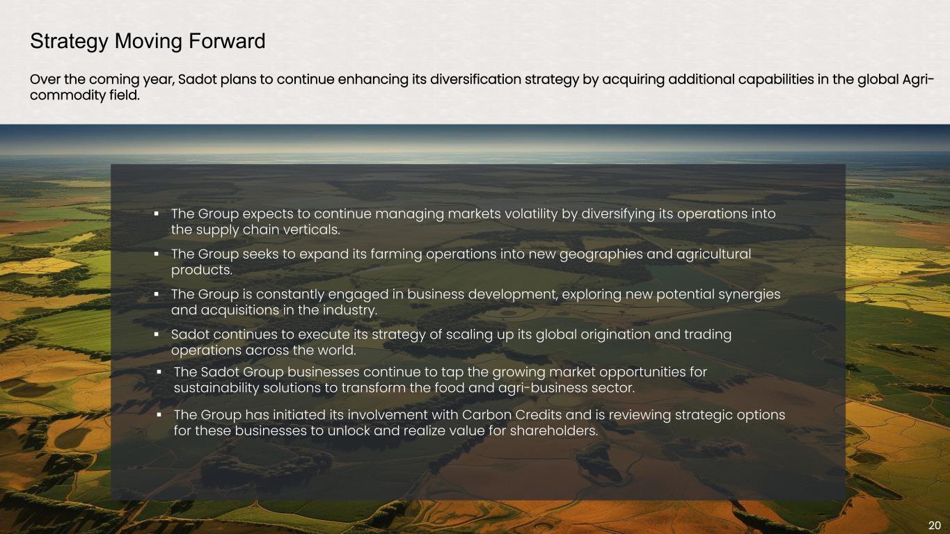 20  The Group expects to continue managing markets volatility by diversifying its operations into the supply chain verticals.  The Group seeks to expand its farming operations into new geographies and agricultural products.  The Group is constantly engaged in business development, exploring new potential synergies and acquisitions in the industry.  Sadot continues to execute its strategy of scaling up its global origination and trading operations across the world.  The Sadot Group businesses continue to tap the growing market opportunities for sustainability solutions to transform the food and agri-business sector.  The Group has initiated its involvement with Carbon Credits and is reviewing strategic options for these businesses to unlock and realize value for shareholders. 20 Strategy Moving Forward Over the coming year, Sadot plans to continue enhancing its diversification strategy by acquiring additional capabilities in the global Agri- commodity field.
